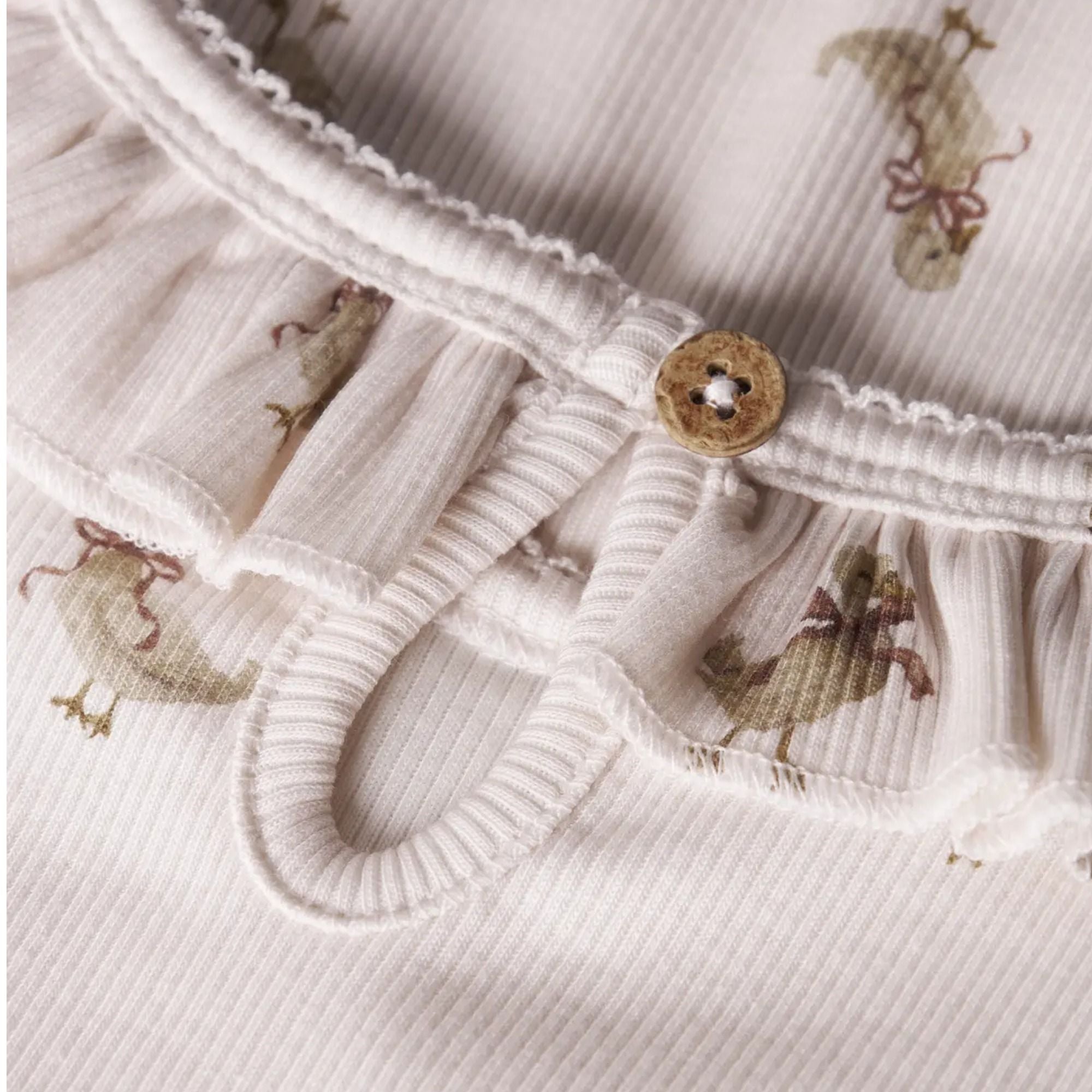 Dieses Kinder Langarm-Shirt aus weicher Bio-Baumwolle überzeugt durch seine feine Ripp-Optik und den verspielten All-Over-Print. Der gerüschte Kragen verleiht dem Shirt einen charmanten Akzent, während der kleine Knopf im Nacken das An- und Ausziehen erleichtert. Komfortabel und nachhaltig, eignet es sich perfekt für den Alltag oder besondere Anlässe.