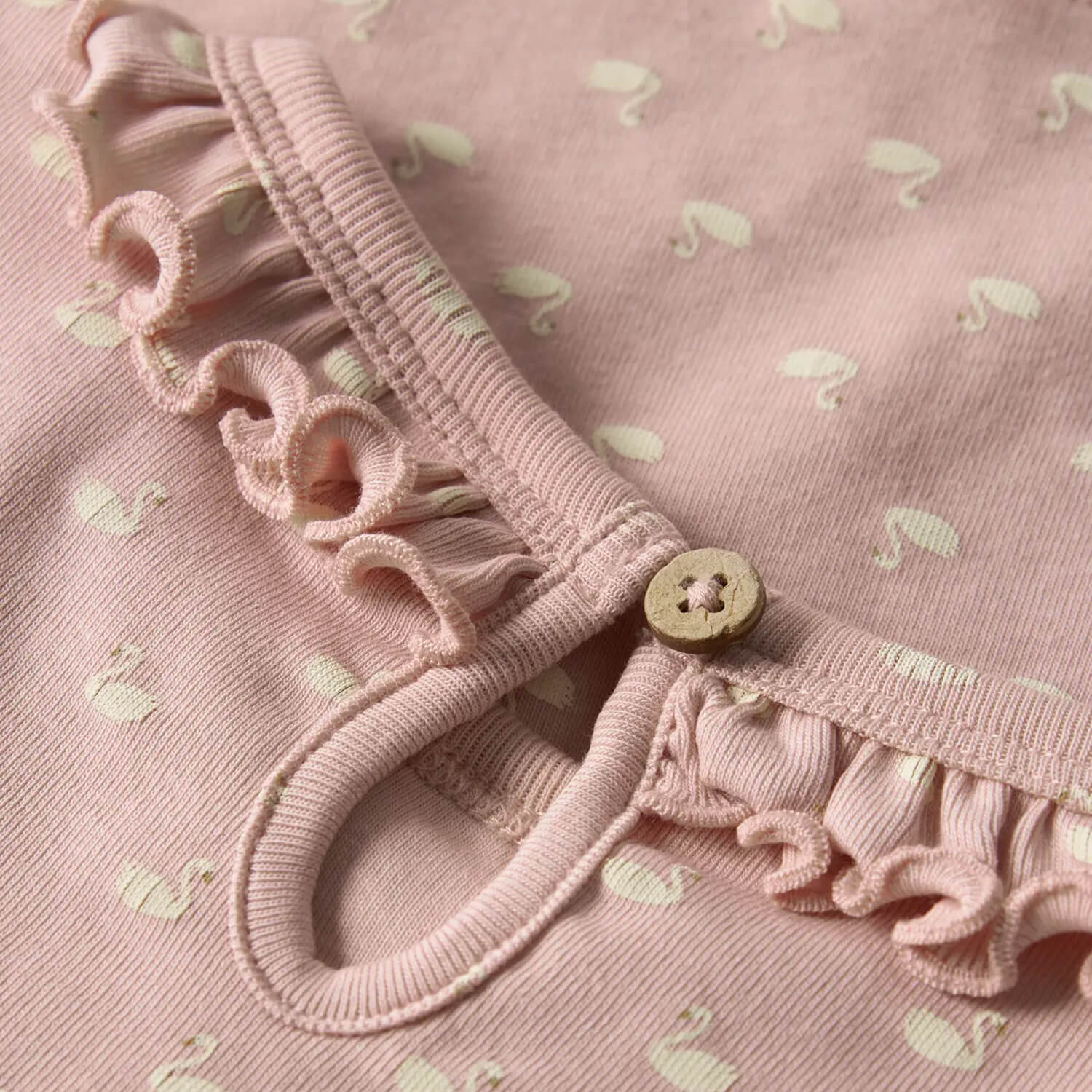Dieses süße Langarm-Shirt für Kinder besteht aus einer Mischung aus Bio-Baumwolle und Lyocell, die für besonders hohen Tragekomfort sorgt. Der zarte Rüschenkragen und der elegante Schwan-All-Over-Print machen das Shirt zu einem echten Hingucker. Der Knopf im Nacken ermöglicht ein einfaches An- und Ausziehen. Ideal für jeden Tag, bietet dieses Shirt nicht nur Stil, sondern auch eine nachhaltige und weiche Passform, die die Haut deines Kindes verwöhnt. Ein perfektes Kleidungsstück für kleine Entdecker!