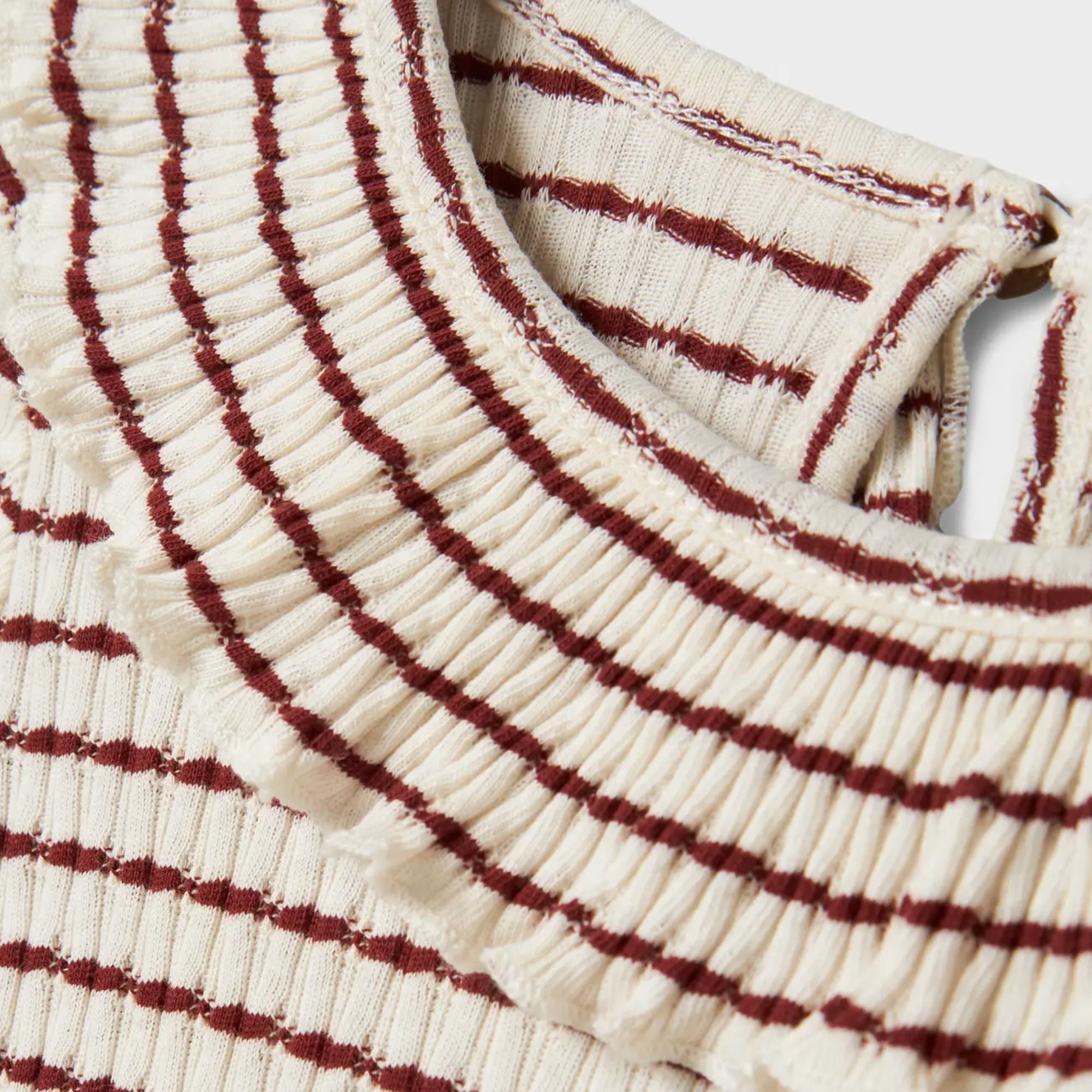 Dieses liebevoll gestaltete Kinderoberteil vereint zeitlose Streifen mit moderner Ripp-Optik und wird so zum besonderen Hingucker. Der weiche, elastische Jersey schmiegt sich angenehm an die Haut und bietet den ganzen Tag über höchsten Tragekomfort sowie viel Bewegungsfreiheit. Der Rundhalsausschnitt ist mit einem zarten Rüschenbesatz verziert, der dem Design eine verspielte und stilvolle Note verleiht. Dank des kleinen Knopfverschlusses im Nacken lässt sich das Oberteil ganz einfach an- und ausziehen. Mit seiner schmalen Passform und dem klassischen Streifenmuster passt es perfekt zu Jeans, Röcken oder Latzhosen – ein vielseitiges Kleidungsstück für Alltag und besondere Momente.
