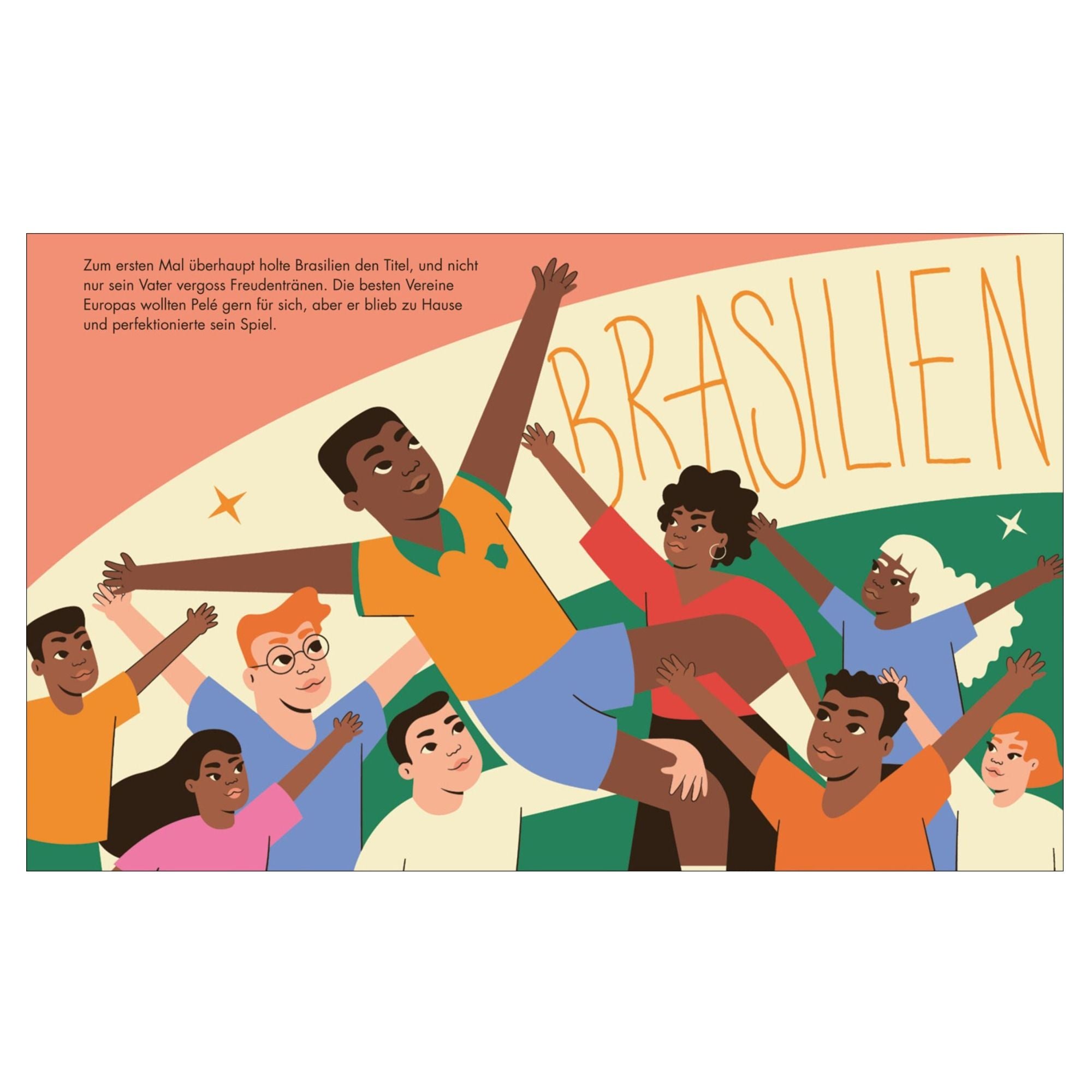 Der kleine Pelé liebte es, auf den Straßen Brasiliens zu kicken. Weil er sich keinen Fußball leisten konnte, bastelte er sich aus einer Socke und Zeitungspapier selbst einen. Eines Tages versprach er seinem Vater, die WM für Brasilien zu gewinnen. Und das tat er, mit nur 17 Jahren! Pelé wurde der größte Fußballer aller Zeiten, er schoss mehr als 1000 Tore, spielte mit vollem Körpereinsatz und engagierte sich für benachteiligte Kinder.