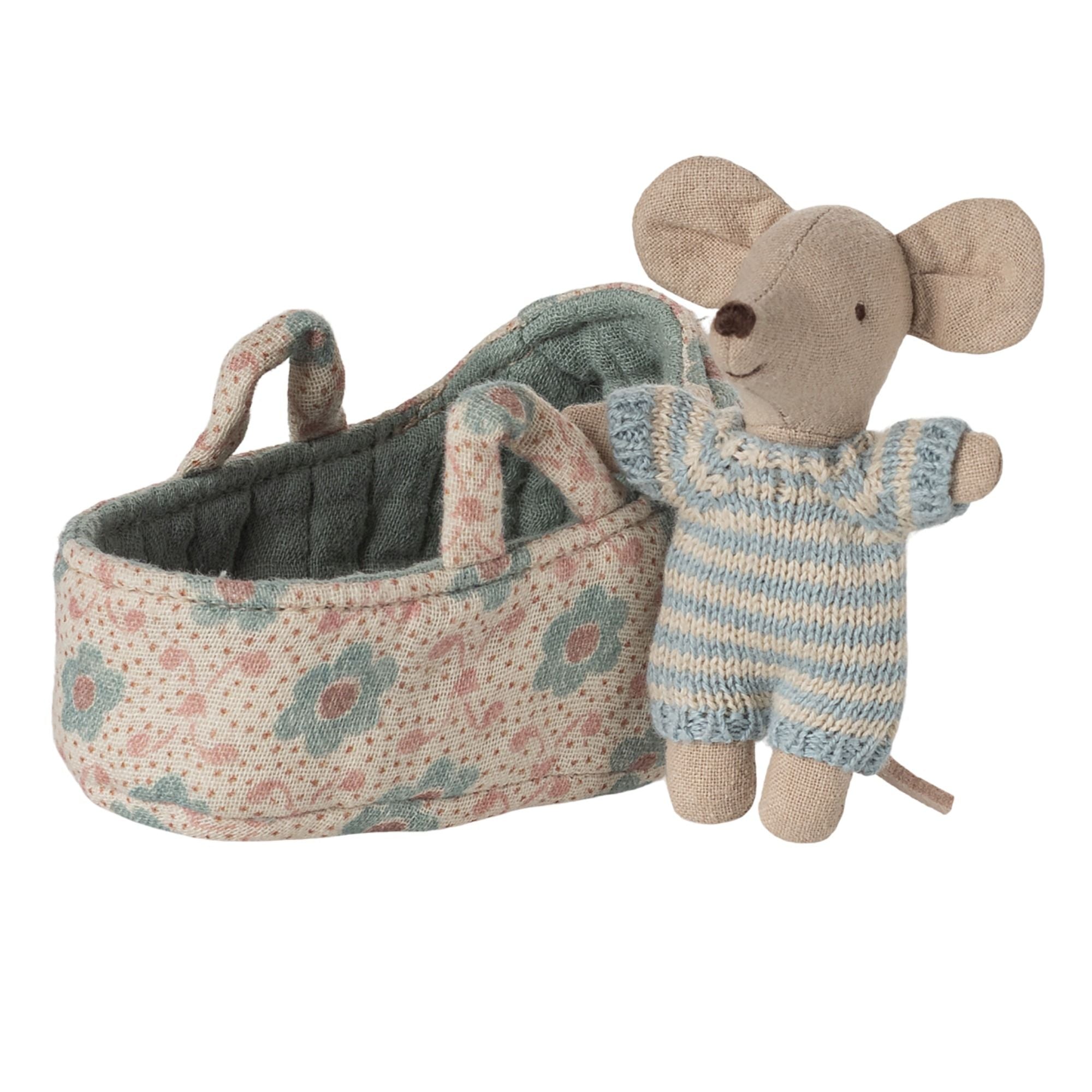 Ein zartes Mäusebaby zieht in seine gemütliche Tragetasche ein – entweder in sanftem Rosé oder klassischem Blau. Die kleine Maus trägt einen gestreiften Strickanzug und ruht im gepolsterten Nest mit Decke. Ob zum Spielen, Sammeln oder Träumen – dieses besonders liebevoll gestaltete Set bringt Wärme und Fantasie ins Kinderzimmer.