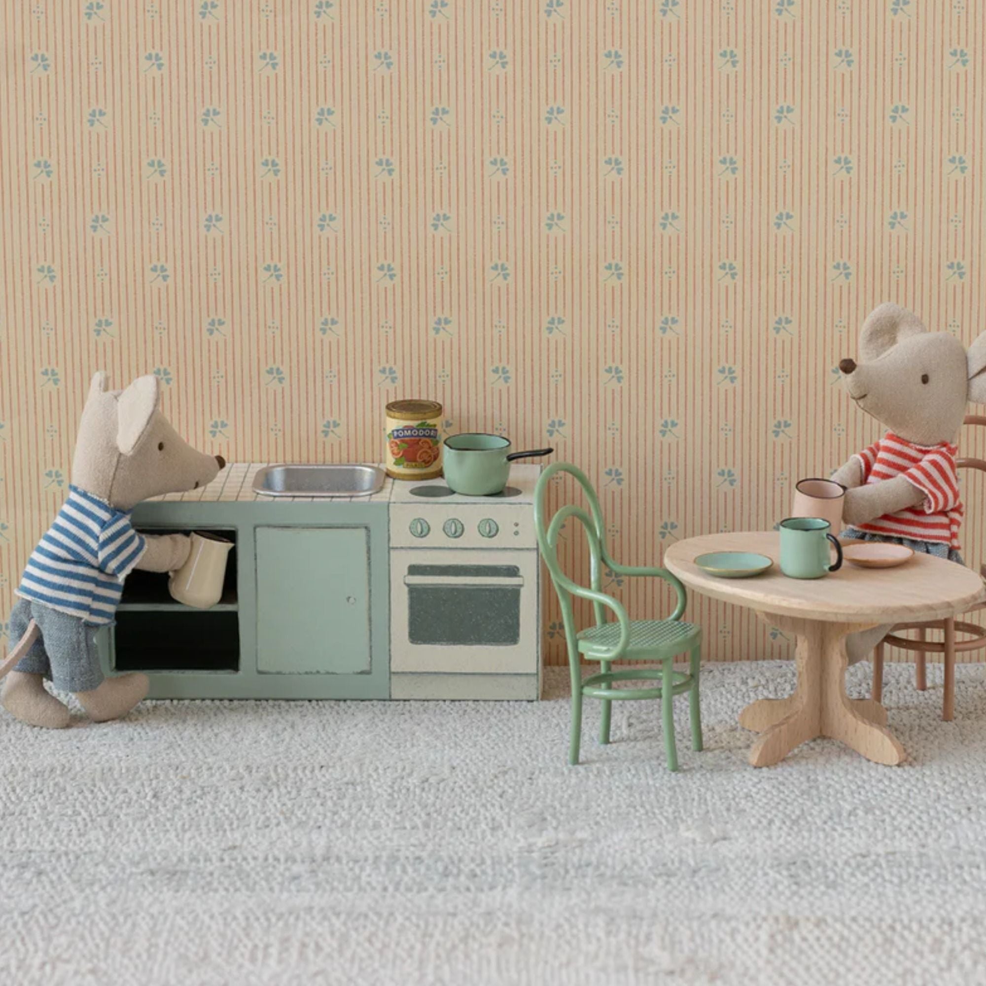 Die kleine Küchentheke bringt alles mit, was für ein liebevolles Mini-Küchenszenario gebraucht wird. Sie enthält zwei Tassen, zwei Teller, einen Topf, einen Krug sowie eine kleine Dose – perfekt für das Spielen und Nachahmen alltäglicher Küchenmomente. Das integrierte Waschbecken besteht aus Metall und wirkt dadurch besonders realistisch. In Kombination ergibt sich ein charmantes, detailreiches Set, das ideal in die Küche des SuitCasa Mäusehauses passt und jede Spielwelt bereichert.