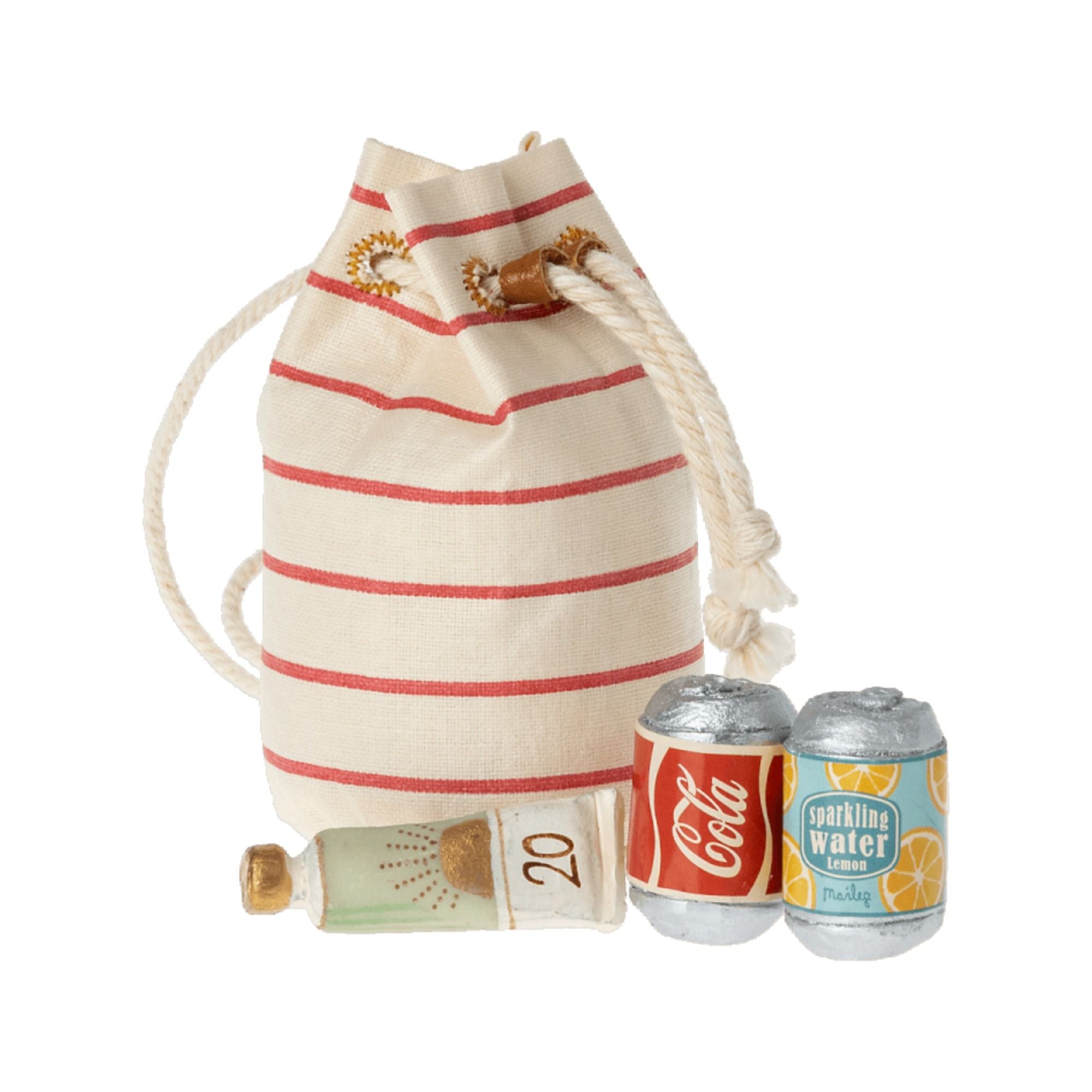 Ferienzeit! Diese kleine Tasche enthält Sonnencreme und 2 Limonaden. Alles in einer Miniaturgröße, die den kleinsten Maileg Freunden passt. Bitte beachte, dass Sonnencreme und Getränkedosen nicht geöffnet werden können.