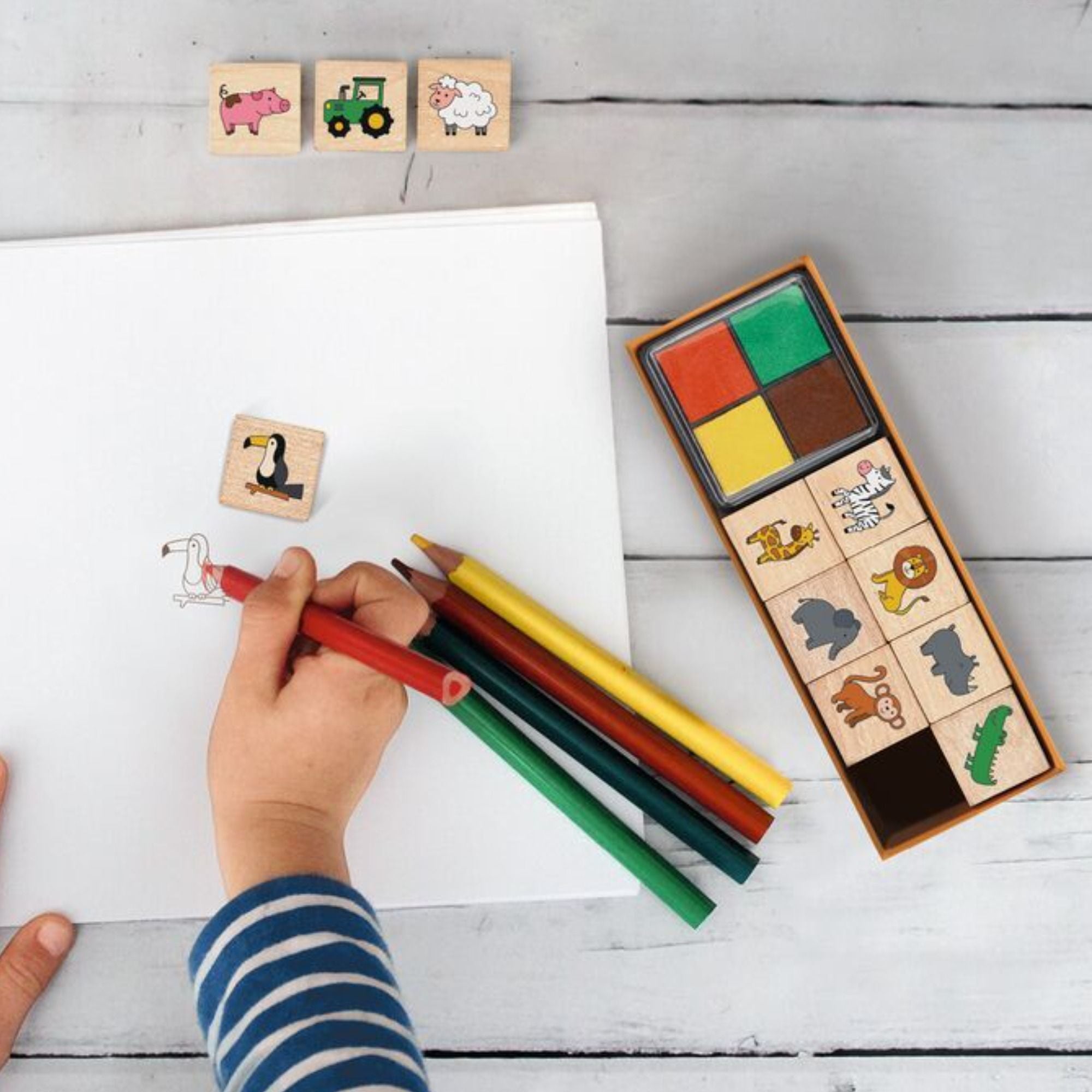 Stempel gehören einfach zum Basteln dazu – ob zum Verzieren von Karten, Gestalten von Bildern oder zum freien kreativen Ausprobieren. Mit unseren Stempelsets fällt die Auswahl leicht: Jedes Set enthält gleich acht verschiedene Stempel zu einem Thema sowie ein vierfarbiges Stempelkissen. So entstehen im Handumdrehen bunte Kunstwerke – ganz ohne Grenzen für die Fantasie. Die Stempel bestehen aus robustem Holz und liegen dank ihrer handlichen Form besonders gut in kleinen Kinderhänden.