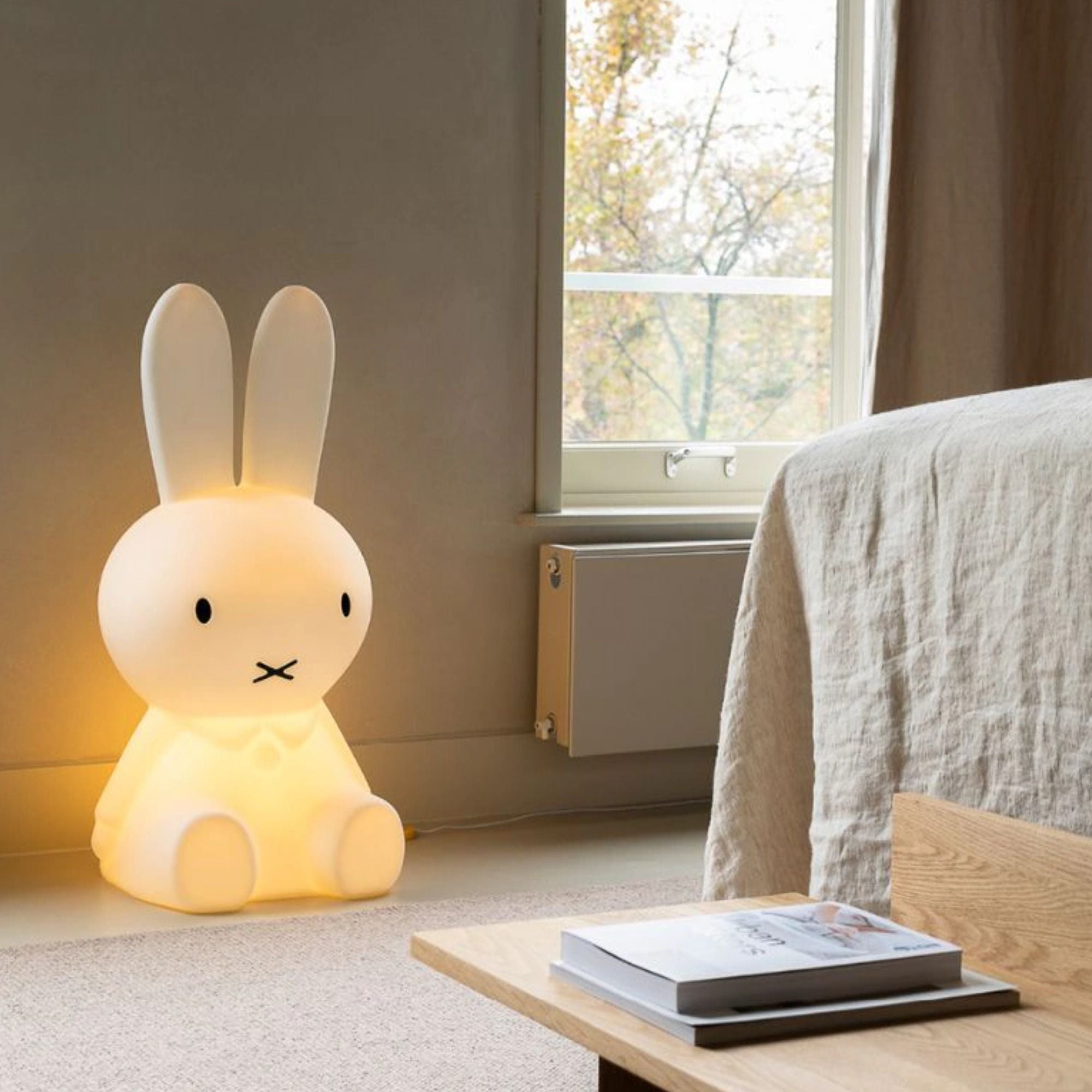 Ein verträumtes Design, das man sofort ins Herz schließt: Unsere 80 cm große Miffy-Lampe wird in jedem Raum zum besonderen Blickfang. Mit ihrer sanften Ausstrahlung und dem liebevollen Charakter schafft sie eine warme, beruhigende Atmosphäre und macht jeden Abend gemütlicher als je zuvor. Ob im Kinderzimmer, Wohnzimmer oder in einer kuscheligen Leseecke – die Miffy-Lampe bringt Stil, Charme und ein Gefühl von Geborgenheit in jeden Wohnbereich. Miffy bereitet Ihnen keine Probleme, denn mit einem feuchten Tuch können Sie sie ganz einfach reinigen.