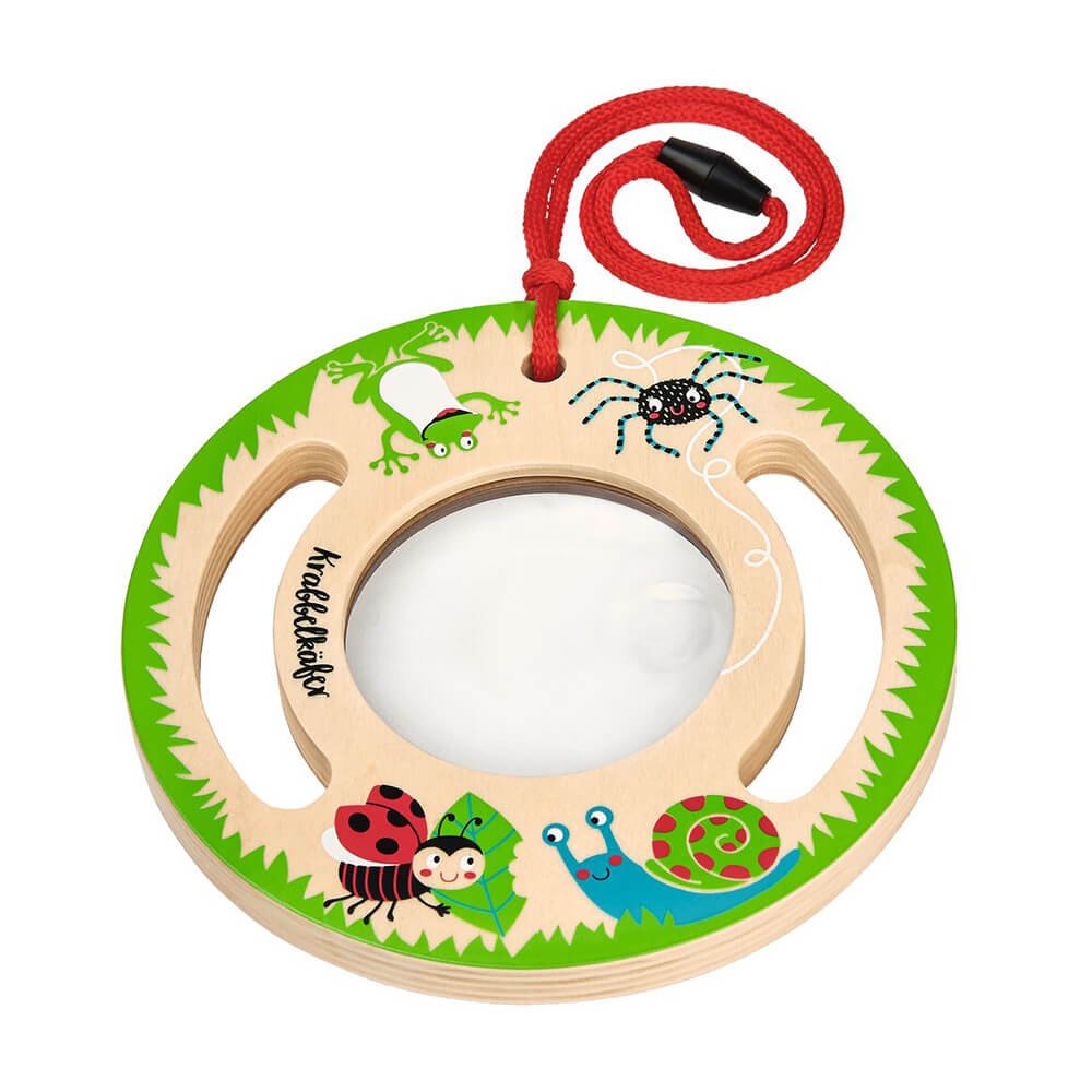 Draußen im Grünen gibt es viel zu entdecken. Und was könnte neugierigen Kleinkindern mehr Spaß machen, als die Vielfalt der Natur ganz genau zu erkunden? Die große Krabbelkäfer-Lupe XXL hilft kleinen Entdecker*innen dabei, alle Details von Blättern, Blumen, Tierchen oder Alltagsgegenständen zu bestaunen. Das niedliche Krabbelkäfer-Design der Lupe macht sofort gute Laune und passt thematisch ideal zur Entdeckungstour in Wald, Wiesen oder dem heimischen Garten. Das große Lupenglas ermöglicht eine 2-fache Vergrößerung, die kleine Detaillupe darin lässt Dinge sogar 4-fach größer erscheinen. So werden selbst winzige Einzelheiten sichtbar. Dank der beiden praktischen Griffe aus Holz, die ideal für kleine Kinderhände geeignet sind, lässt sich die Lupe ganz einfach greifen und sicher festhalten. Für extra Sicherheit sorgt außerdem das praktische Umhängeband mit Sicherheitsverschluss. Einfach umhängen und schon kann die Lupe überall mit hingenommen werden ohne verloren zu gehen. Ein Muss für die Kleinsten, die nach und nach die Welt um sich herum entdecken!