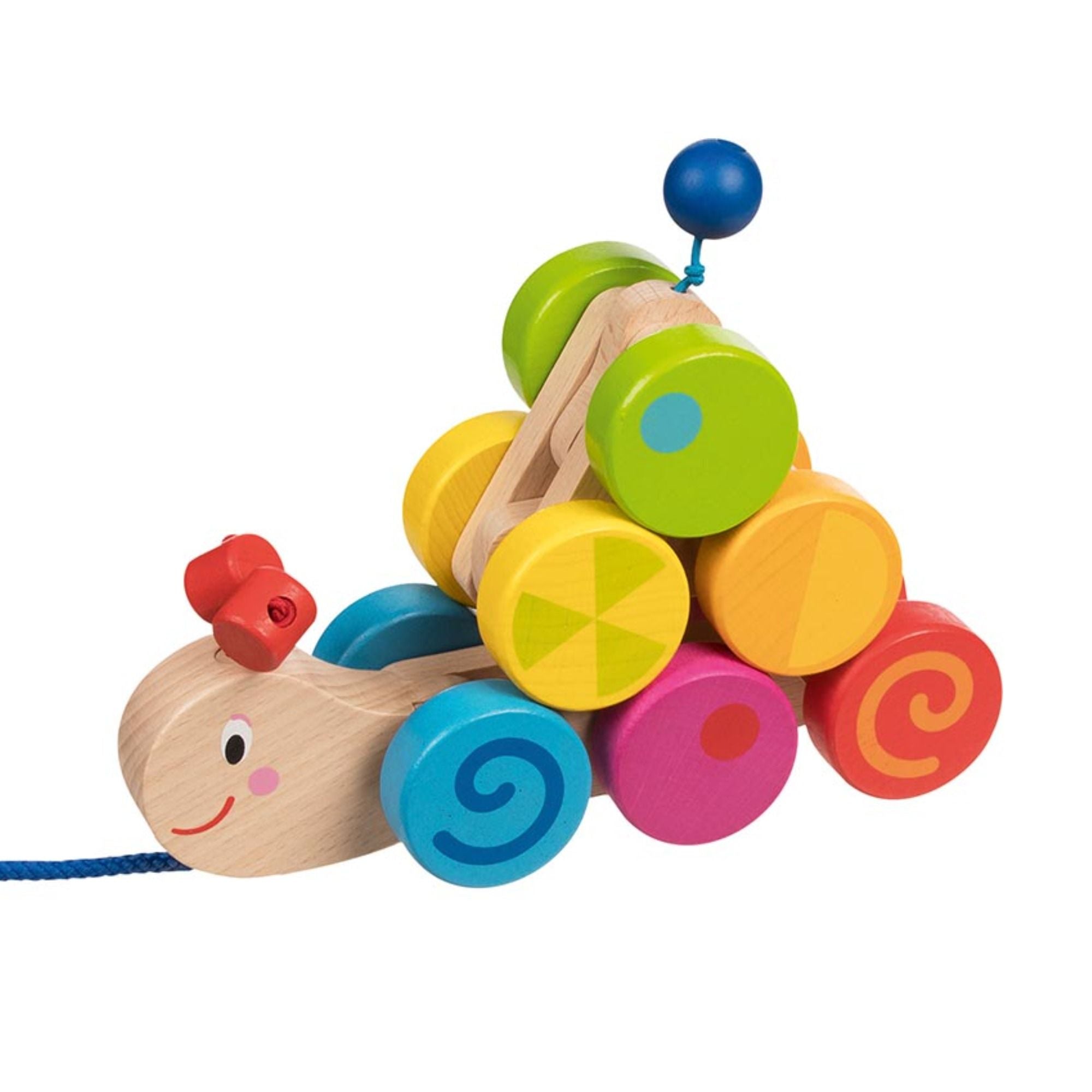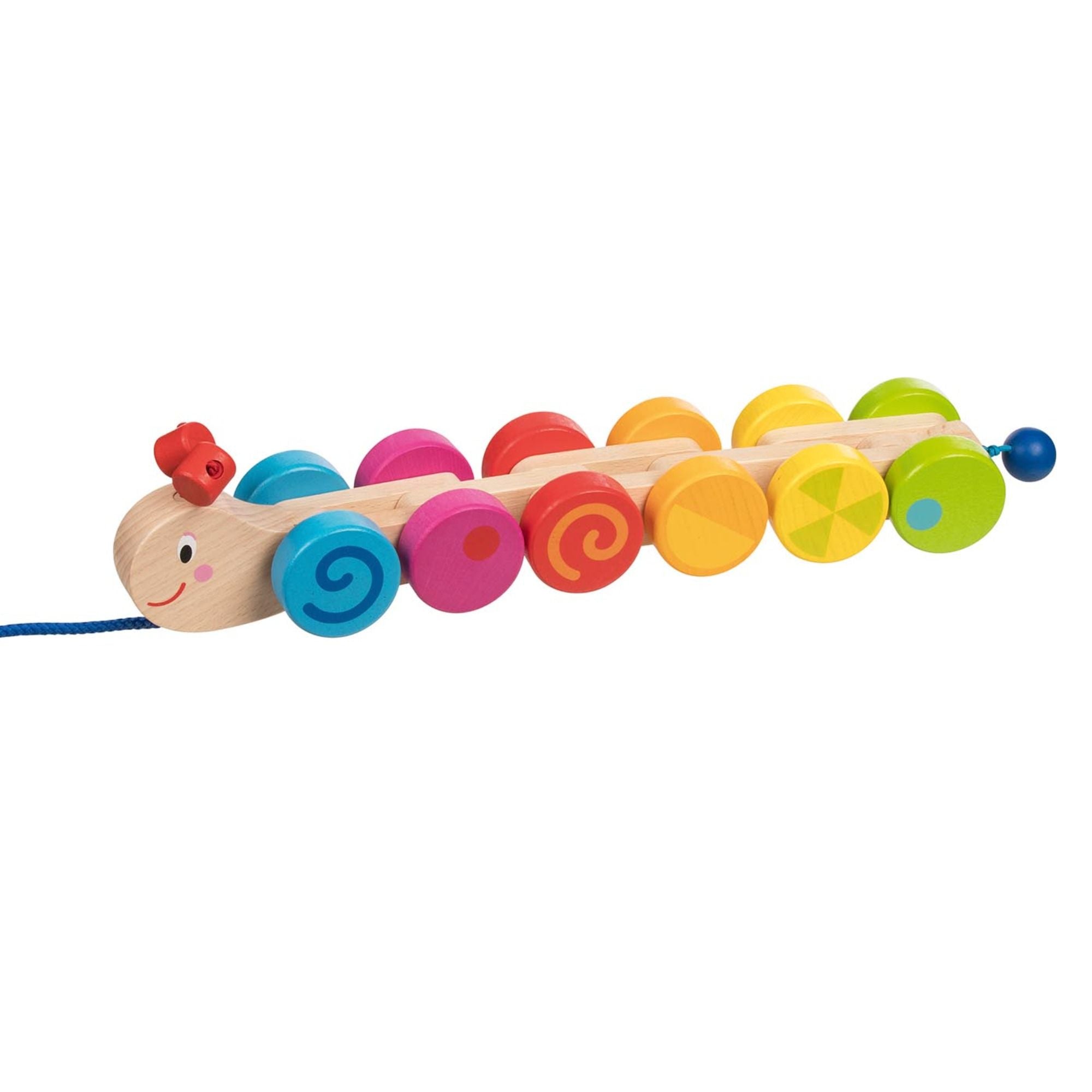 Dieses Ziehspielzeug aus Massivholz besticht durch seine farbenfrohe Gestaltung und die ineinandergreifenden Glieder, die eine besondere Bewegung beim Ziehen ermöglichen. Die unterschiedlich gestalteten Räder erzeugen ein lebendiges Farbspiel. Zusätzlich lassen sich die einzelnen Glieder zu einer Pyramide stapeln, ohne dass die Ziehfunktion beeinträchtigt wird, sodass das Spielzeug vielseitige Spielmöglichkeiten bietet.
