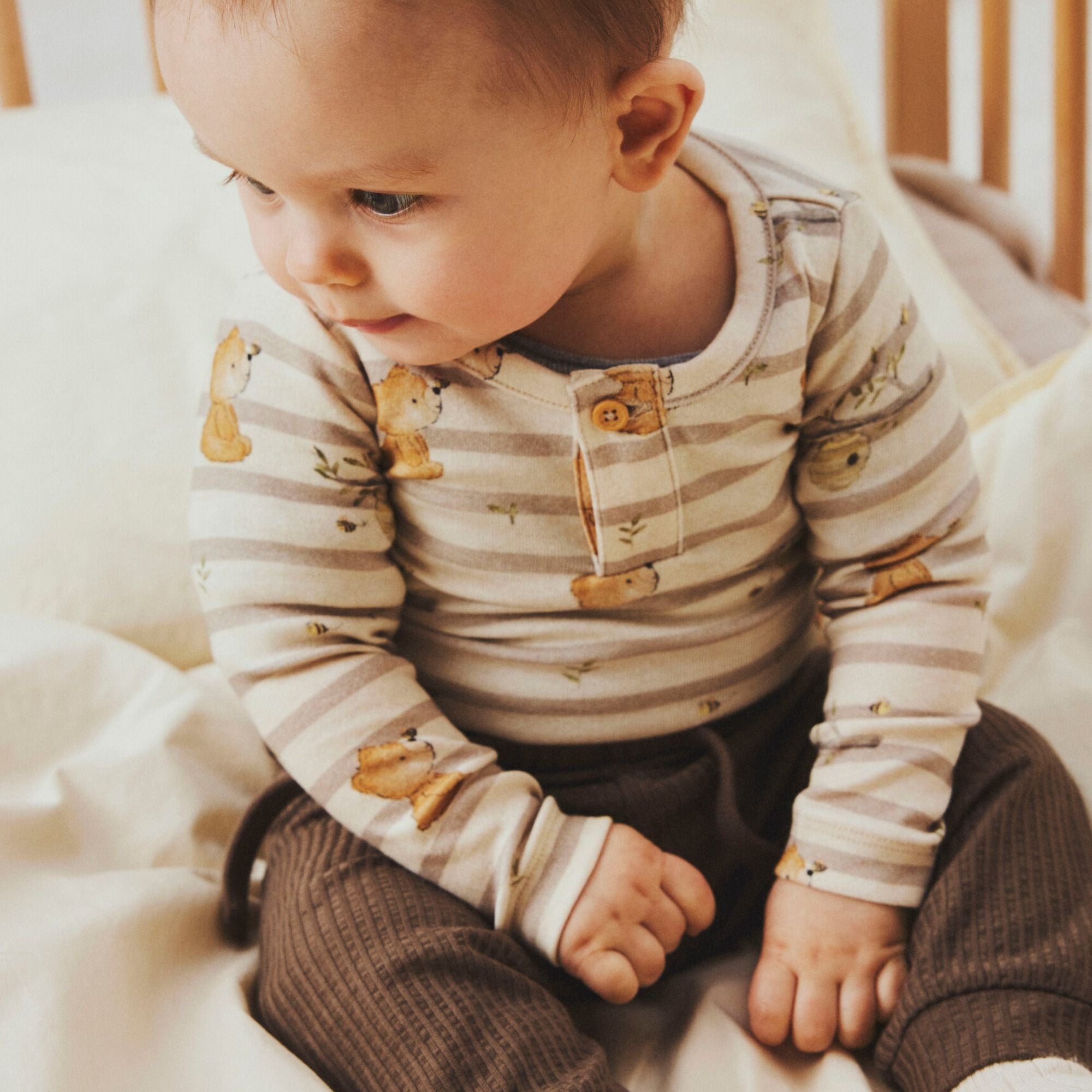 Dieser süße Baby Body kombiniert Komfort und Stil in einem. Der weiche Stoff aus Bio-Baumwolle und sorgt für eine besonders sanfte Haptik auf der zarten Babyhaut. Das charmante All-Over-Print-Design verleiht dem Body eine verspielte Note, während die kurze Knopfleiste mit einem Knopf das An- und Ausziehen erleichtert. Die praktischen Druckknöpfe im Schritt bieten zusätzliches Komfort für das Wickeln.