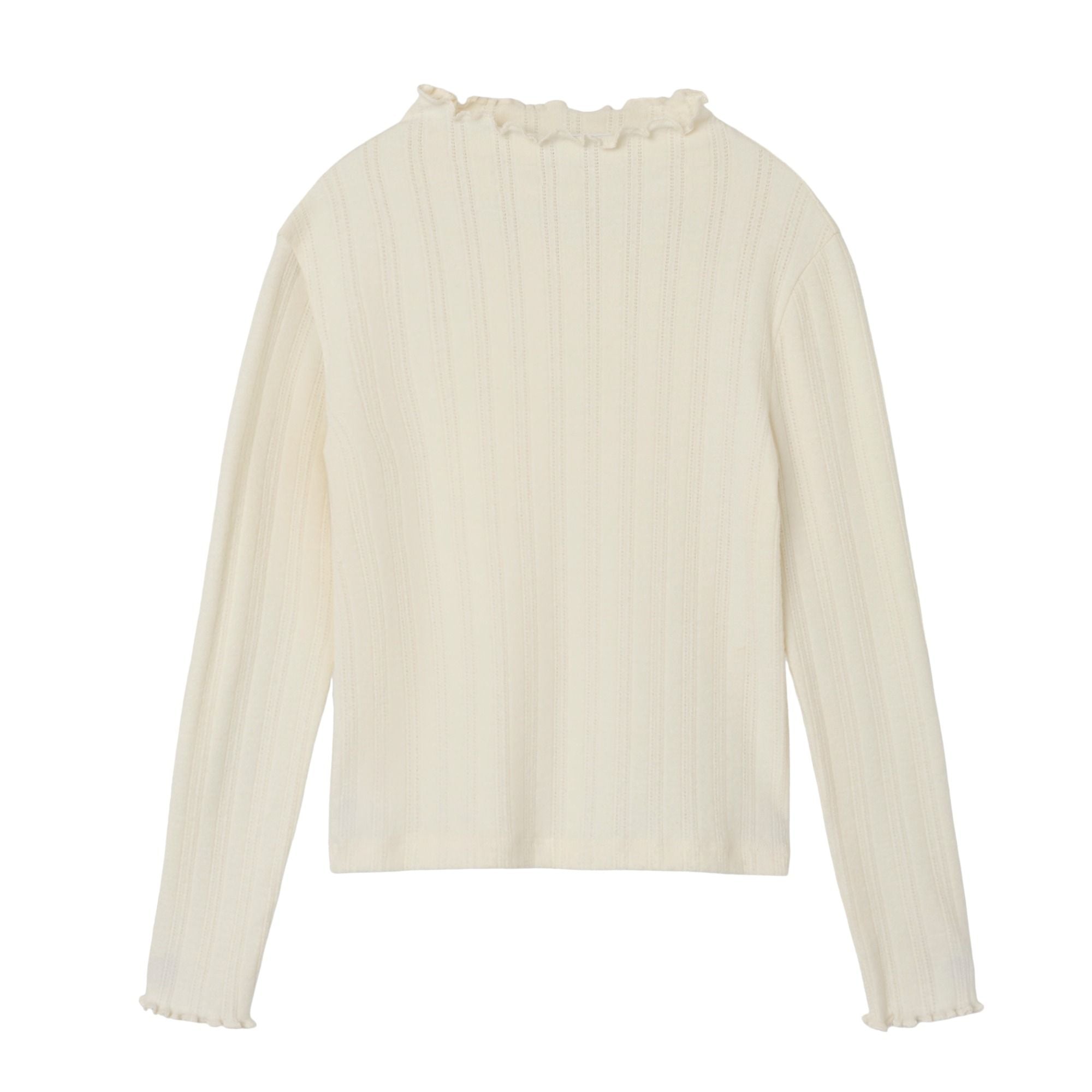 Dieses stilvolle Kleidungsstück vereint Komfort und elegantes Design. Hergestellt aus einer hochwertigen Mischung aus Bio-Baumwolle und Viskose, sorgt es für ein angenehmes Tragegefühl auf der Haut. Die feinen Wellen-Details am erhöhten Kragen und an den Ärmelbündchen verleihen dem Look eine raffinierte Note. Das Pointell-Muster und die Rip-Optik sorgen für eine besondere Textur und machen das Kleidungsstück zu einem echten Hingucker.