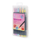 Set mit 12 aquarellierbaren Pinselstiften zum Malen und Gestalten typografischer Schriften. Je nach Neigung der flexiblen Nylon-Pinselspitze lassen sich unterschiedliche Effekte und Stile erzielen. Die Tinte auf Wasserbasis ermöglicht Aquarelleffekte, wenn sie mit Wasser verwischt oder mit einem Pinsel weiter koloriert wird. Das Set kommt im praktischen Kunststoff-Etui und bietet dank fest verankerter Spitzen und kindersicherer Kappen sichere Filzstifte für kreatives Arbeiten.