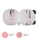 Maniküre-Set „But First, Nails!“ für jederzeit gepflegte Hände und perfekte Nägel, erhältlich in den Varianten Kitty und Panda. Das kompakte Reiseformat macht es ideal für unterwegs, im Urlaub oder für den täglichen Gebrauch zu Hause. Das Set enthält alle wichtigen Werkzeuge für die Nagelpflege: eine Nagelschere, einen Nagelknipser, eine Nagelfeile und einen Nagelhautschieber. Der praktische Reißverschluss hält die Utensilien sicher an ihrem Platz und sorgt für einfache Aufbewahrung. Die Kitty-Variante besticht durch ein verspieltes Katzenmotiv, während die Panda-Variante ein niedliches Bären-Design bietet. Ein perfektes Set für alle, die Wert auf gepflegte Hände legen, kombiniert Funktionalität mit charmantem Design.
