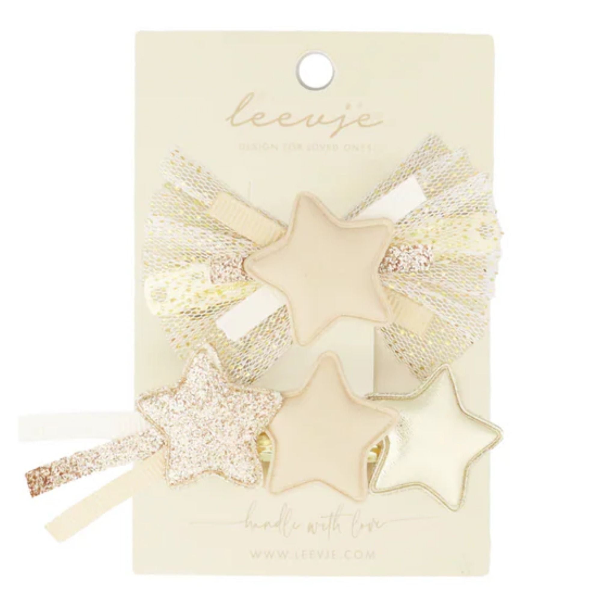 Diese süßen Haarspangen mit glitzernden und glänzenden Details lassen Kinderaugen strahlen. Durch die schlichten leevje-Farben passen sie toll zu jedem Outfit. Schöner Haarschmuck für die feierlichen Tag!