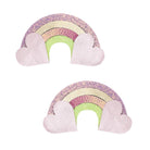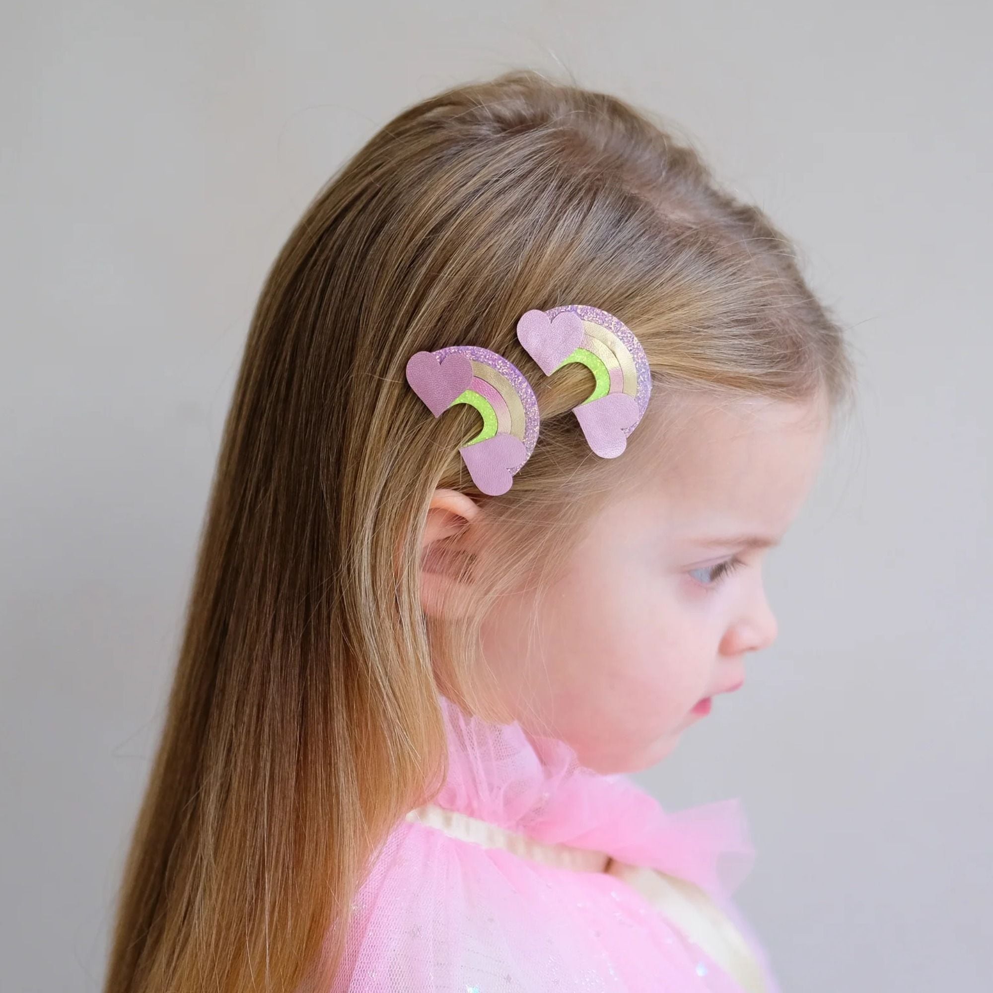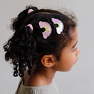 Dieses wunderschöne Paar schimmernder, rosafarbener Regenbogen-Haarspangen bringt überall ein bisschen Wunschmagie mit sich. Die Klick-Klack-Clips sind jeweils ca. 5 cm groß und lassen sich leicht im Haar befestigen. Die Regenbögen bestehen aus einer liebevollen Mischung aus Glitzer- und Metallic-Stoffen und setzen zauberhafte Akzente bei jedem Outfit. In jeder Packung sind zwei Haarspangen enthalten, perfekt für den Alltag, besondere Anlässe oder als kleines Geschenk.