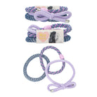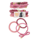 Toll im Haar, aber auch als Armband schön: Zu den Haargummi-Sets von gehören jeweils 3 verschiedene Haargummis (1x uni, 1x mehrfarbig, 1x uni mit Schleife). Es gibt 4 verschiedene Sets mit einem Farb-Schwerpunkt: rosé-beige, rosa-türkis, lila-blau und rosa-braun.