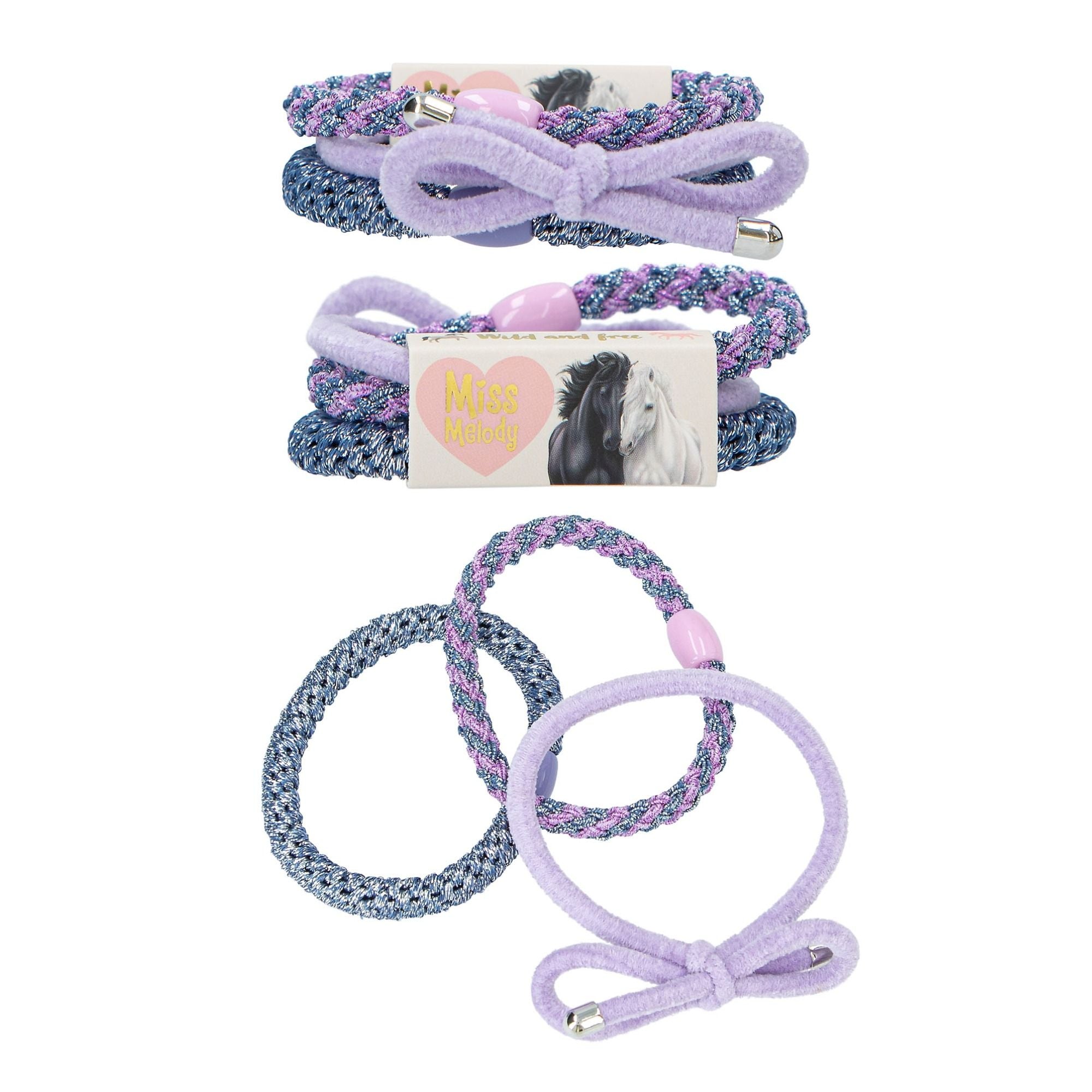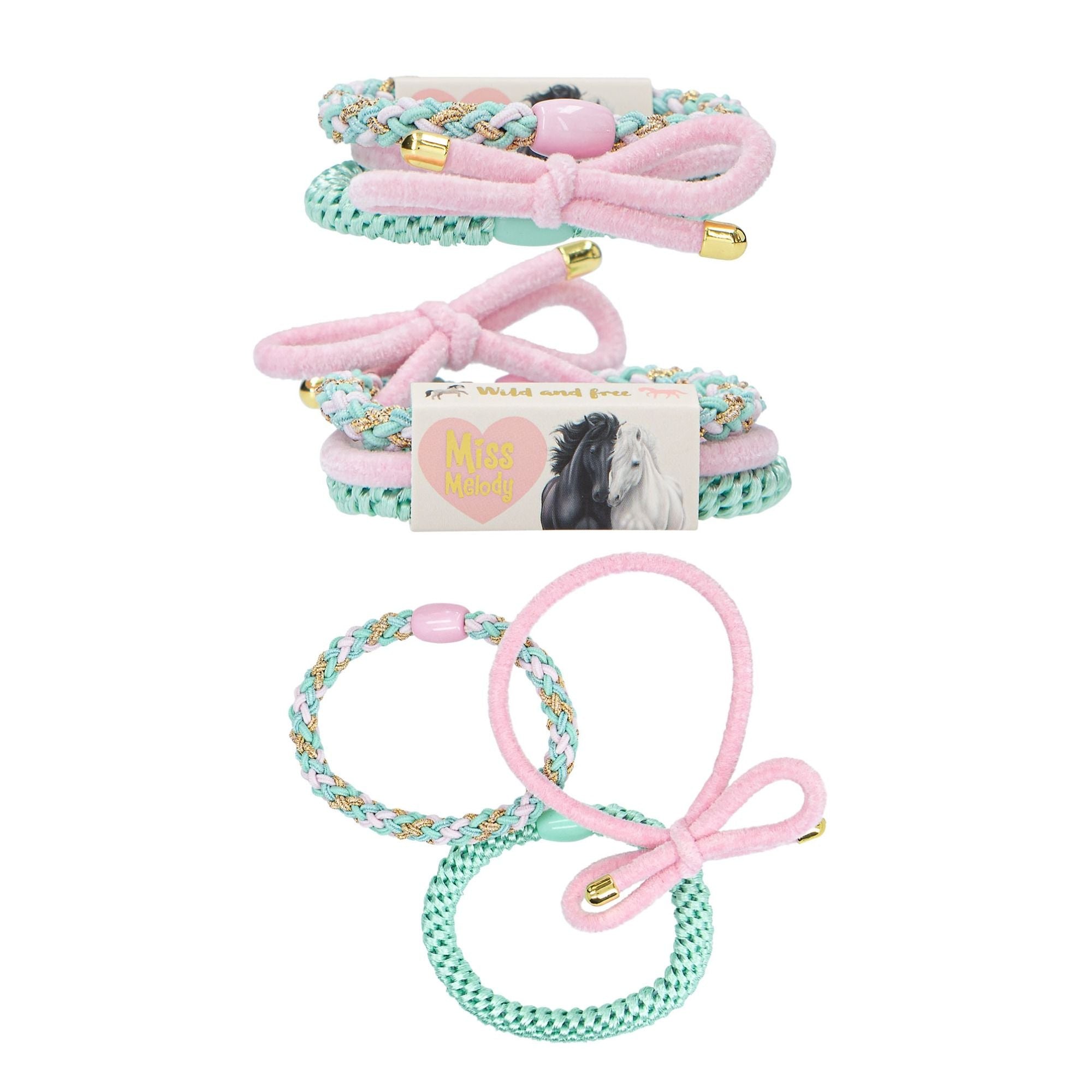• Drei Haargummis im Set (1x uni, 1x mehrfarbig, 1x mit Schleife)