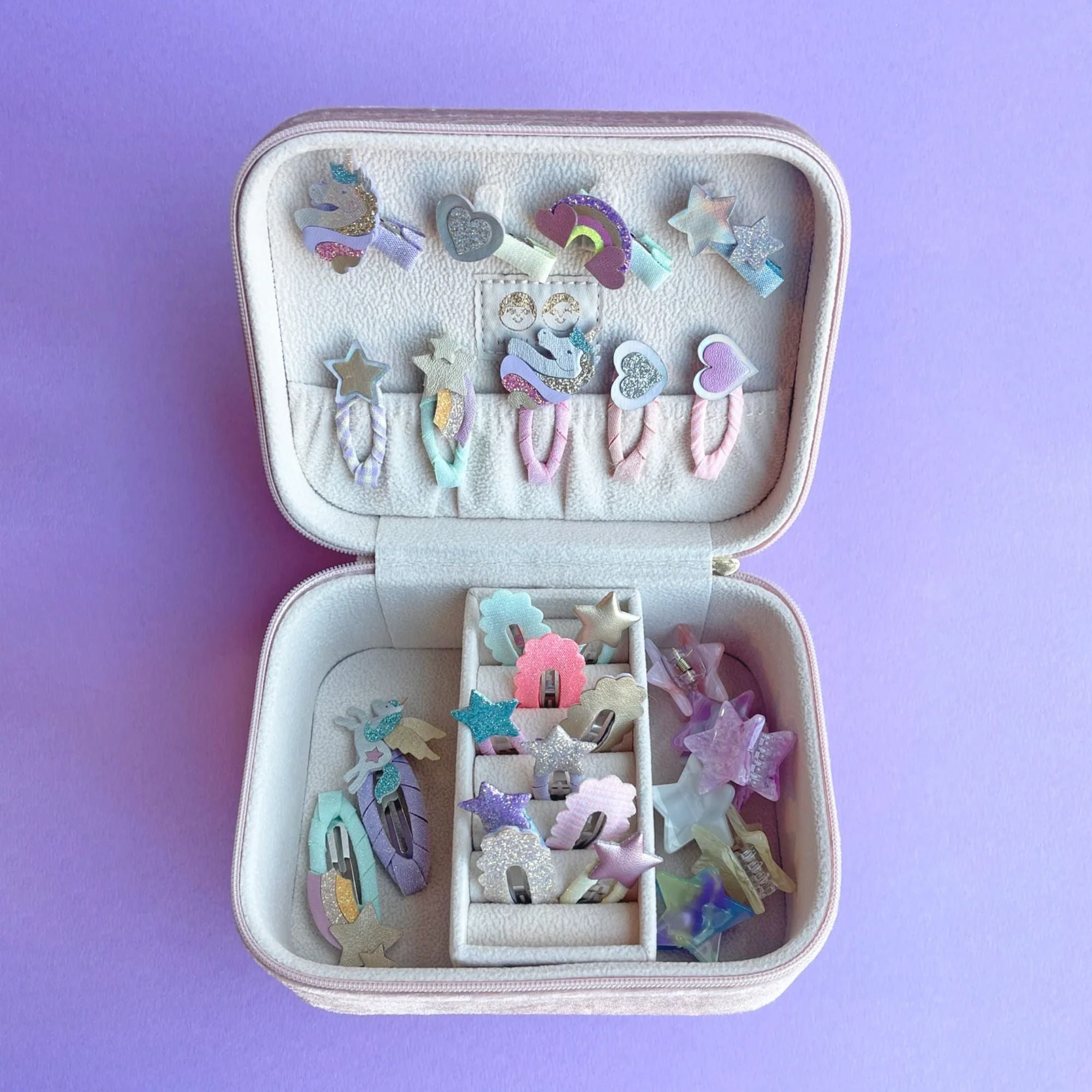 Die Schmuckschatulle ist die perfekte Aufbewahrungsmöglichkeit für die kleinen Schätze Ihres Kindes. Sie eignet sich hervorragend als Geschenk oder als dekorative Ergänzung für den Schminktisch. Die Schatulle verfügt über einen Reißverschluss, einen elastischen Beutel, vier Haken und drei weitere Fächer, die Platz für Schmuck und kleine Gegenstände bieten. Mit den kompakten Maßen ist sie praktisch, vielseitig einsetzbar und passt zu verschiedenen Designs und Motiven.