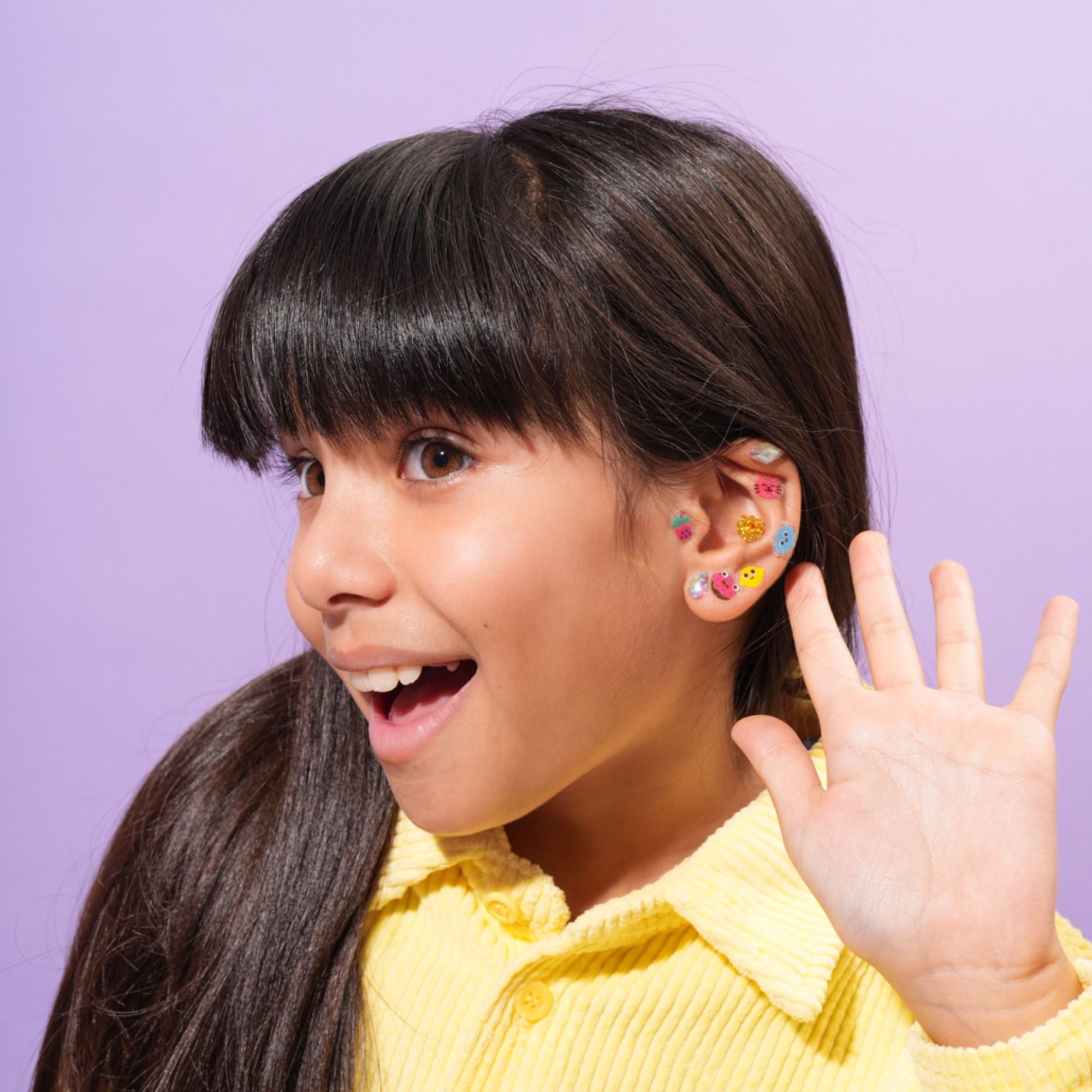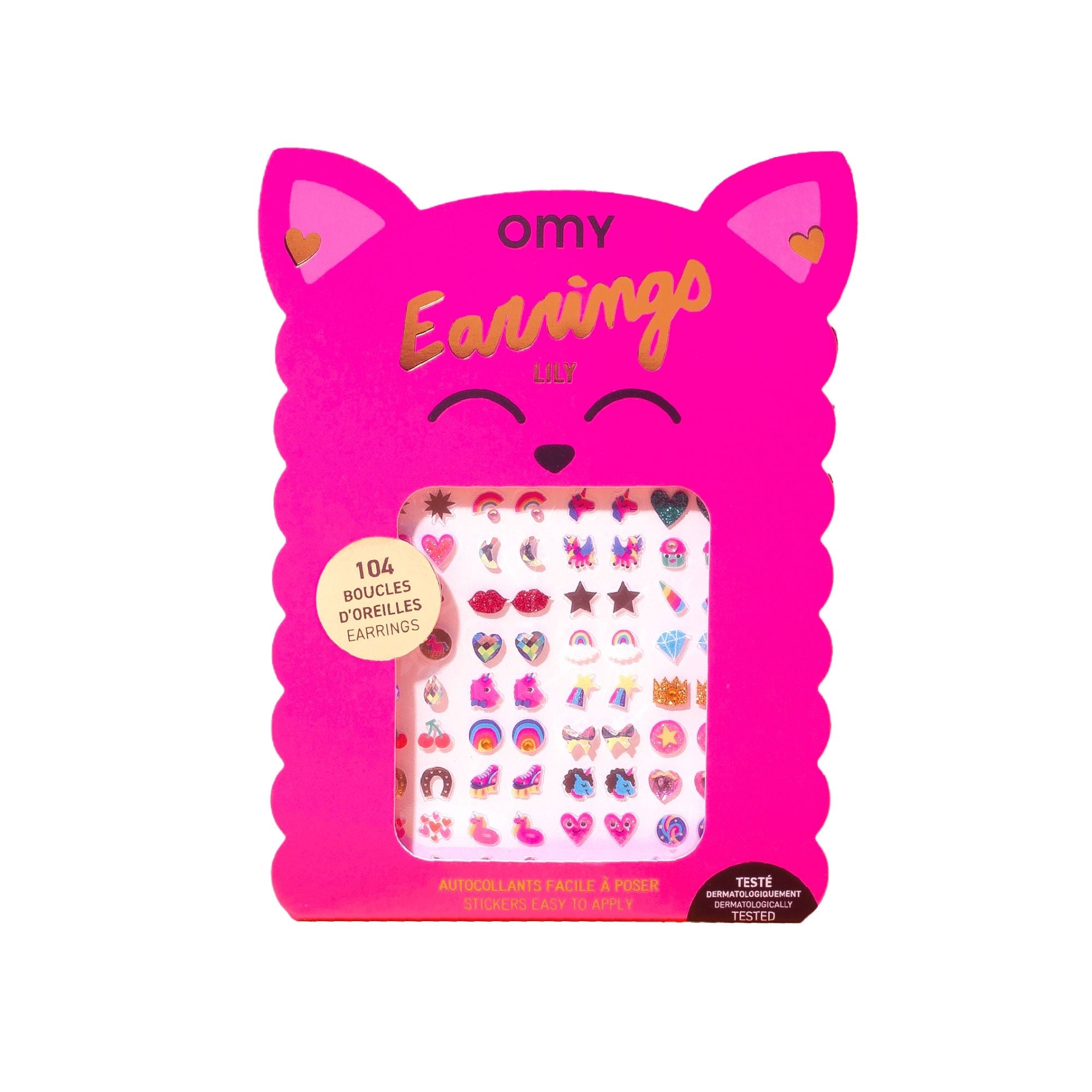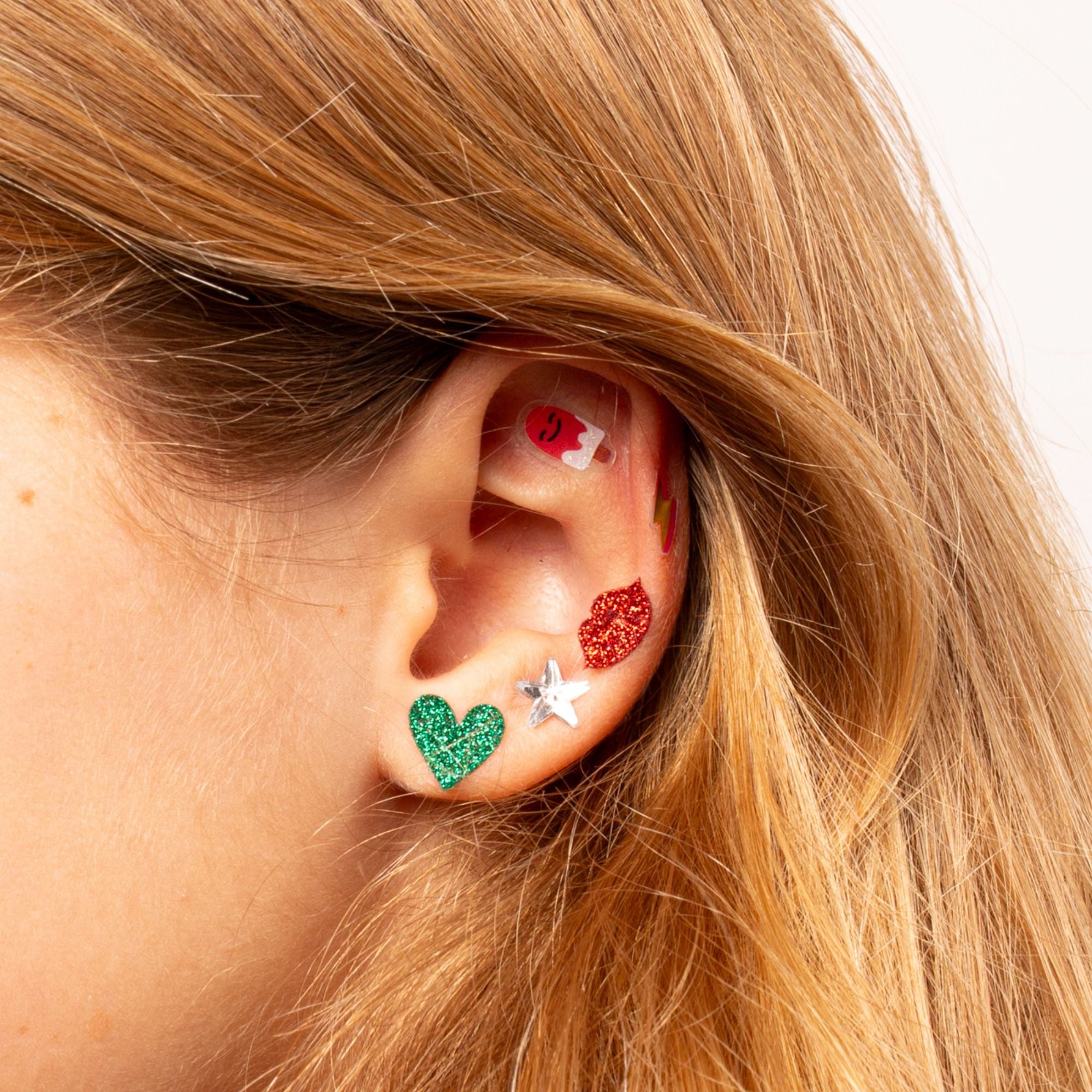 Diese selbstklebenden Ohrringe eignen sich ideal zum fantasievollen Schmücken und sind für Kinder ab 3 Jahren geeignet. Sie lassen sich leicht anbringen, sind dermatologisch getestet und bieten eine sichere Möglichkeit, spielerisch Accessoires zu tragen – ohne Ohrlöcher.