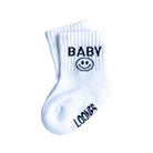 Premiumsocken in weiss aus kuschelig-weicher Bio Baumwolle mit eingewebtem Schriftzug BABY und einem happy Smiley jeweils an der Außenseite.