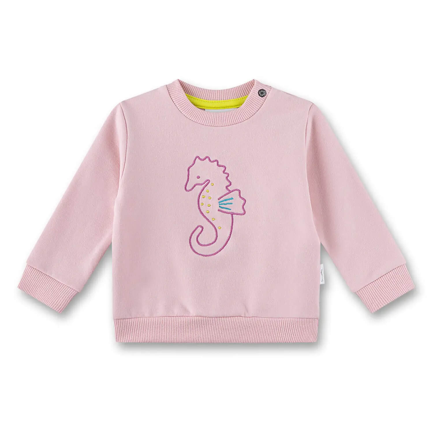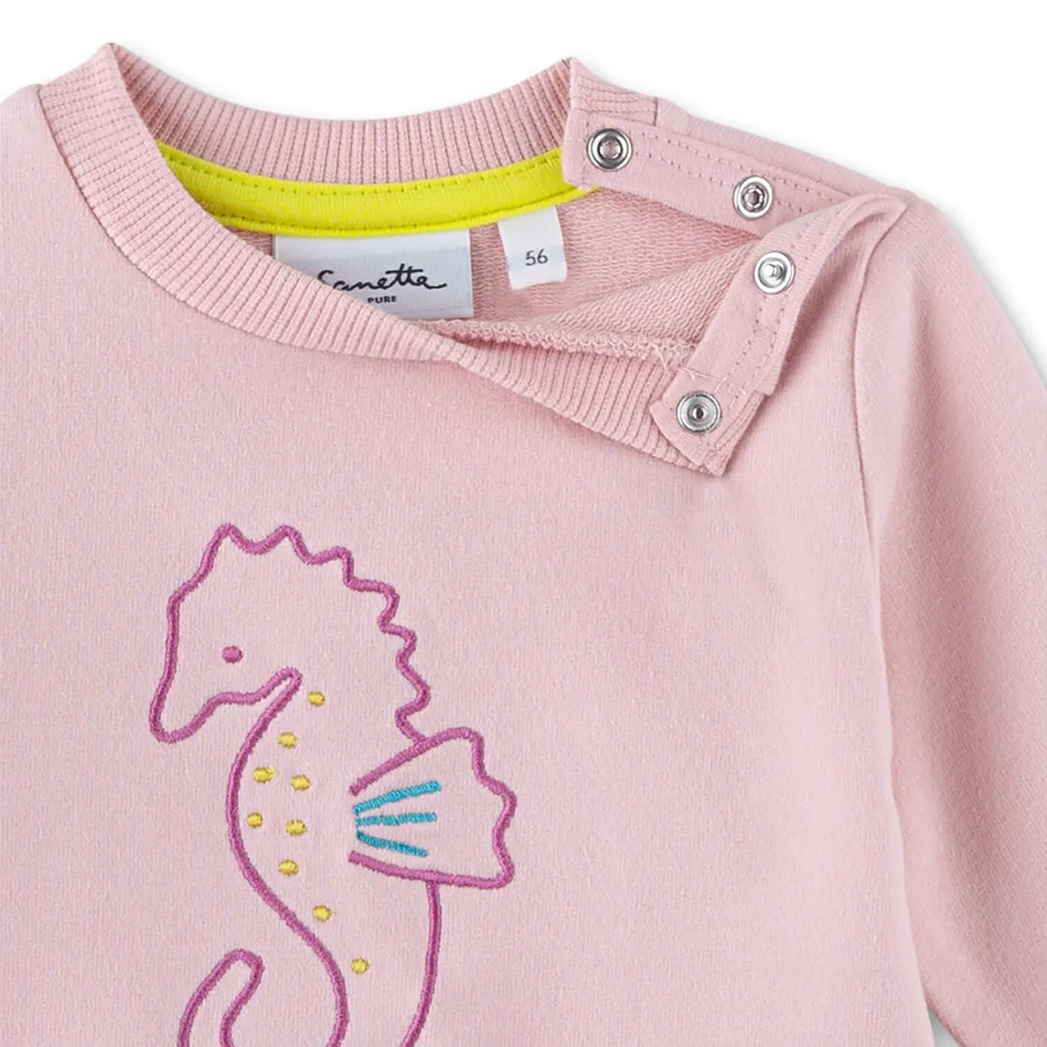 Dieses Baby-Sweatshirt für Mädchen überzeugt mit einem liebevoll gestickten Seepferdchen-Motiv in Lila, verziert mit gelben und blauen Akzenten. Gefertigt aus elastischer Sweatware aus Bio-Baumwolle, bietet es einen kuschelig weichen Tragekomfort – ideal für den Alltag. Gerippte Bündchen an Hals, Ärmeln und Saum verleihen dem Sweatshirt eine sportliche Note, während das kontrastierende gelbe Nackenband einen fröhlichen Farbakzent setzt. Ein praktischer Druckknopfverschluss an der Schulter sorgt zudem für ein unkompliziertes An- und Ausziehen.