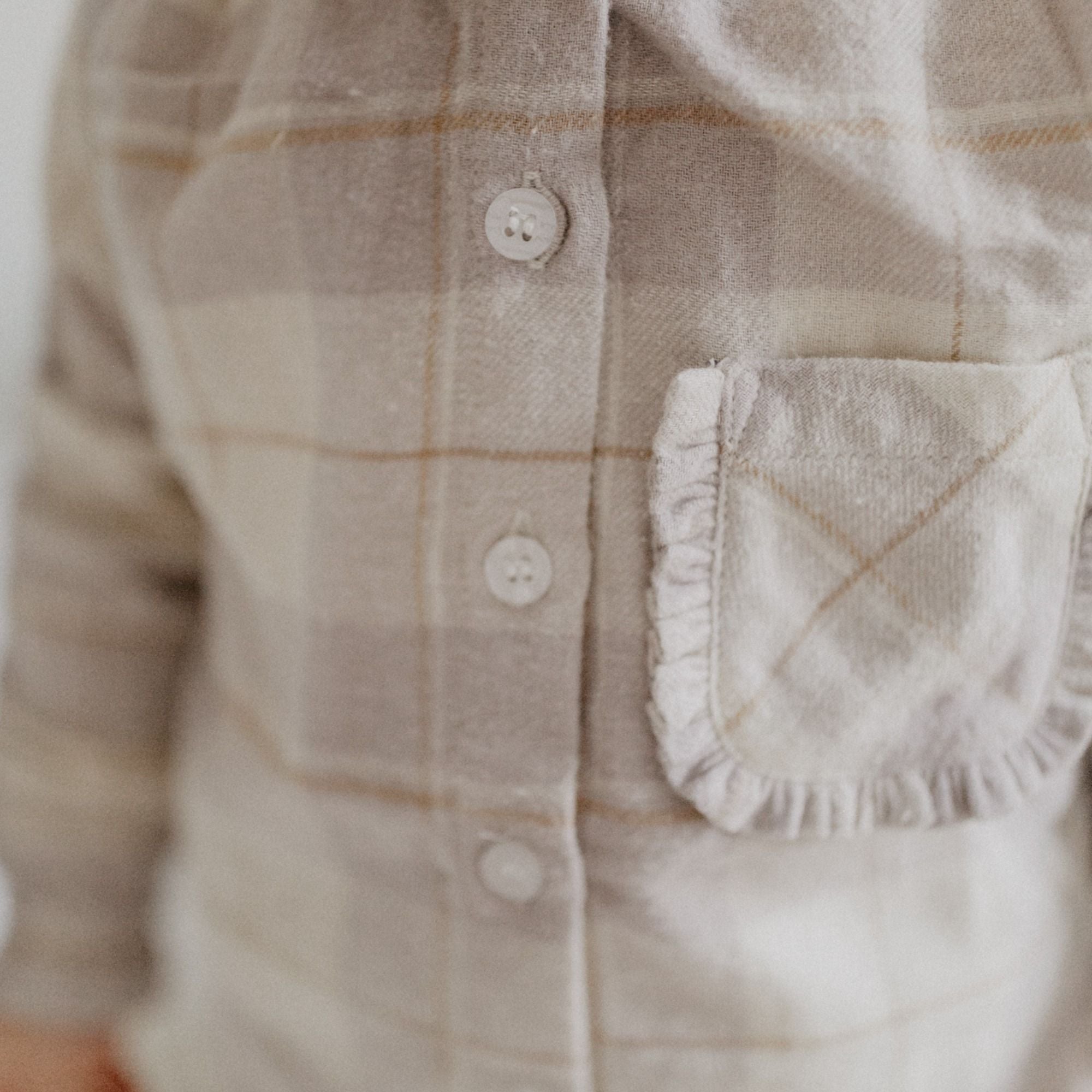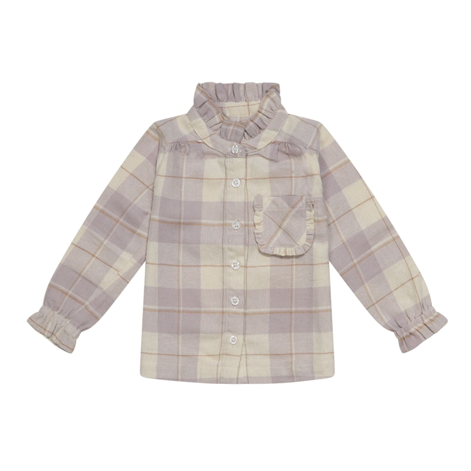 Diese Bluse aus weich angerautem Flanell vereint höchsten Tragekomfort mit einem charmanten, verspielten Design. Der durchgehende Knopfverschluss erleichtert das An- und Ausziehen, während liebevolle Details wie ein kleiner, gerüschter Stehkragen, zarte Rüschen an den Säumen und eine aufgesetzte Brusttasche mit Rüschenbesatz für einen femininen, besonderen Look sorgen.