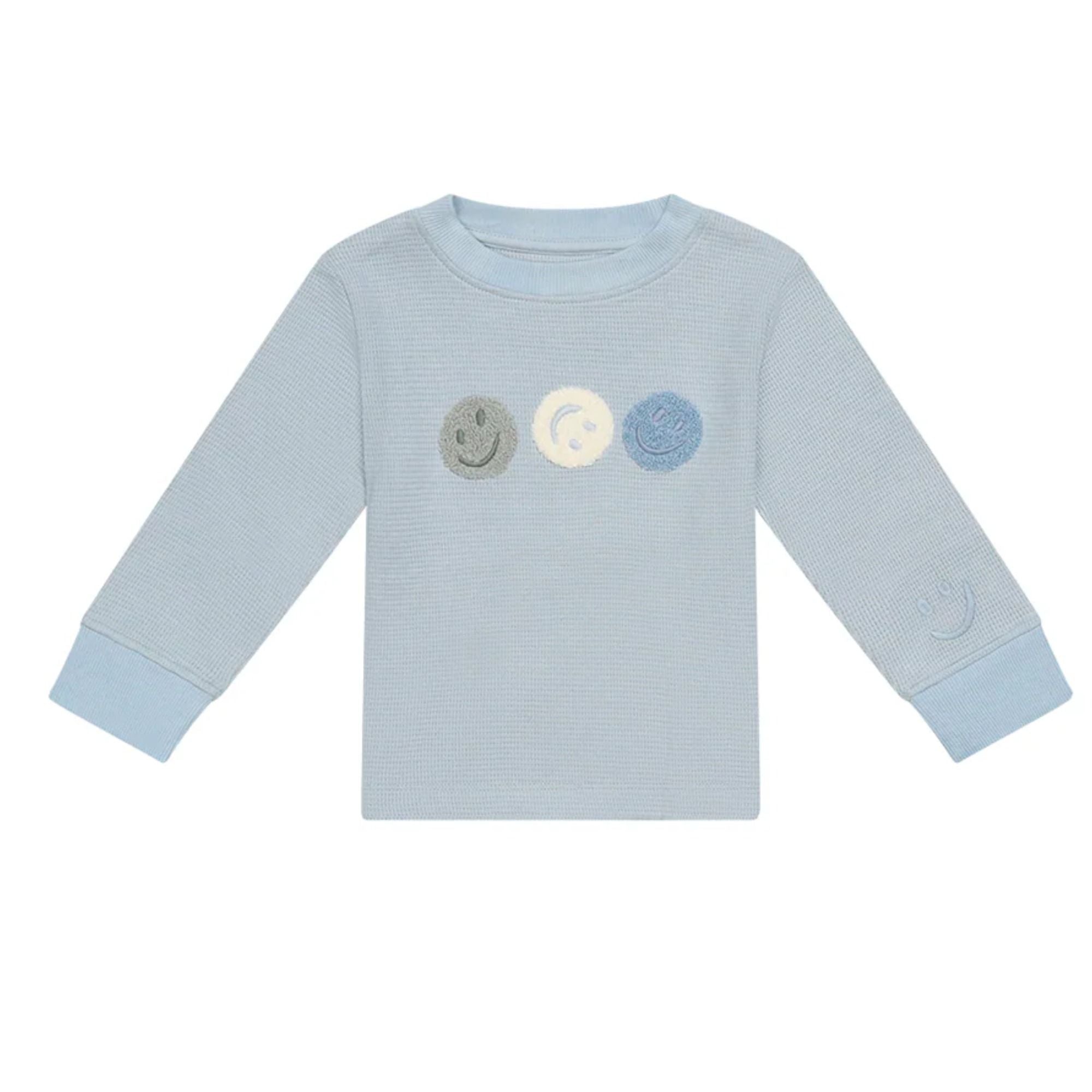 Dieses langärmelige Shirt aus weichem Waffel-Piqué ist perfekt für kleine Abenteurer. Aus Bio-Baumwolle gefertigt, überzeugt es mit besonders hohem Tragekomfort und fühlt sich angenehm weich auf der Haut an. Die drei lustigen Frottee-Smileys auf der Vorderseite zaubern ein Lächeln, während die feine Stickerei am Ärmel dem Shirt einen liebevollen Detailakzent verleiht und es zu einem echten Hingucker macht.