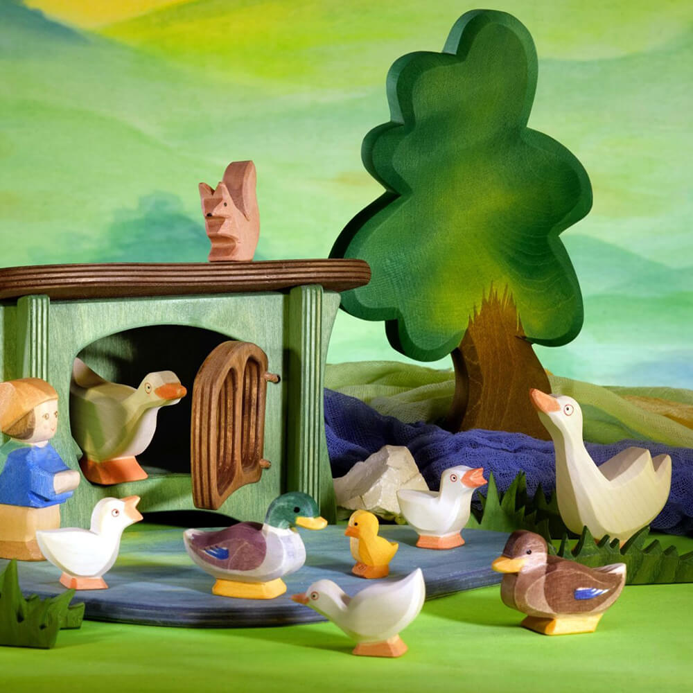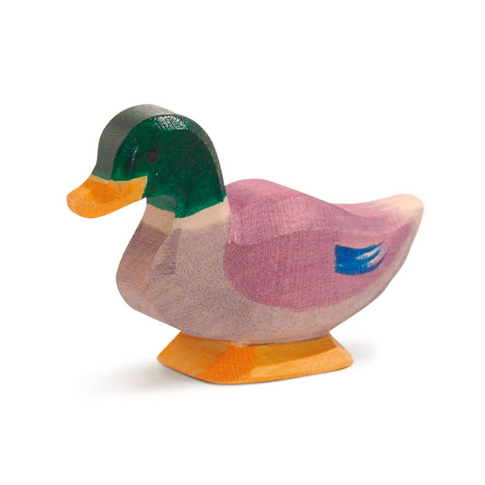 Der Erpel wird in reiner Handarbeit aus Ahornholz hergestellt und mit ausgesuchten Spielzeugfarben bemalt. Er gehört mit zur großen Ostheimer Familie und fördert das Freie Spiel und lässt Raum zur Entfaltung der eigenen Fantasie.