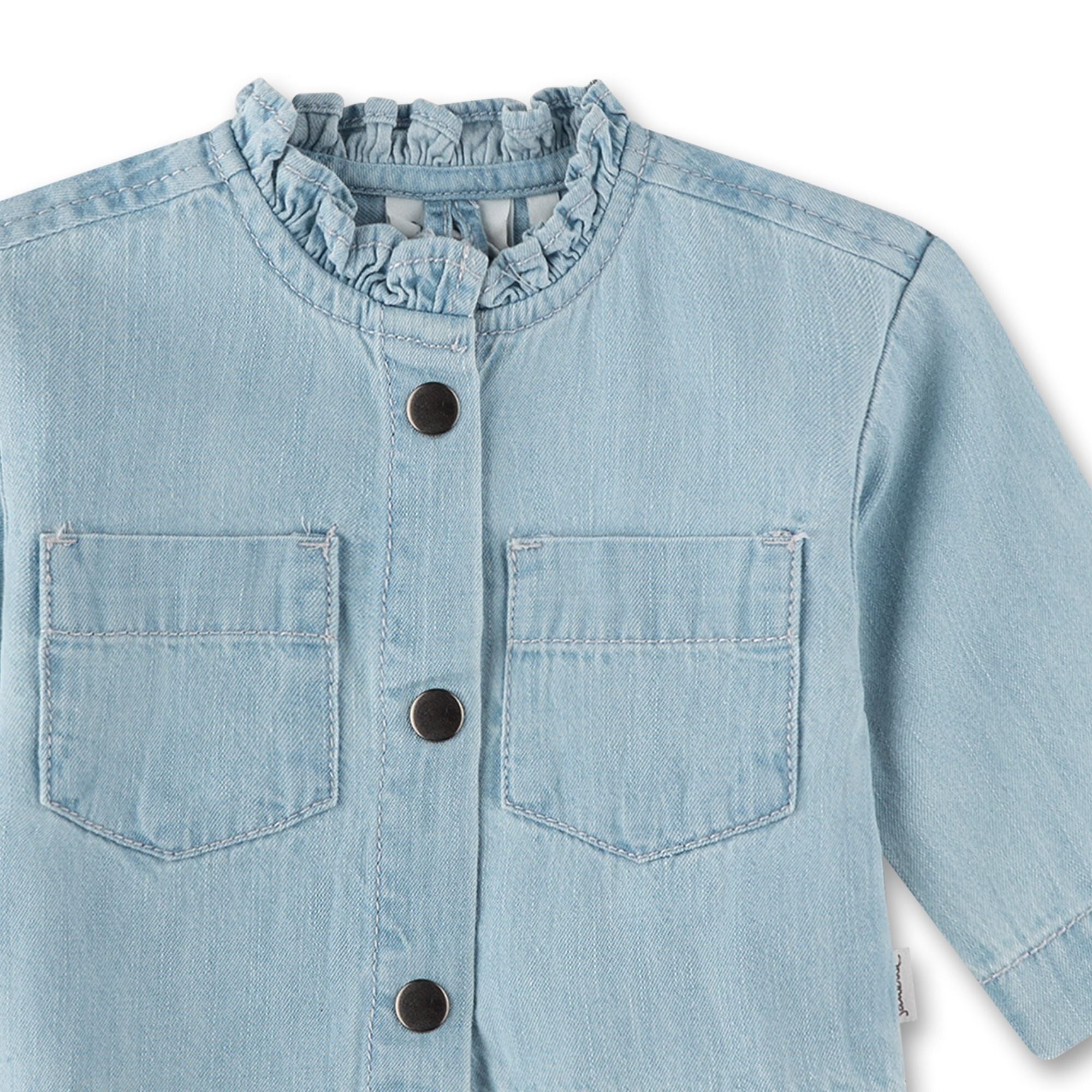 Diese stilvolle Kinderjacke von Sanetta ist die perfekte Ergänzung für jede Garderobe. Das leichte Jeansmaterial aus 100 % Baumwolle sorgt für ein angenehmes Tragegefühl und bietet optimalen Komfort an warmen Tagen. Der verspielte Rüschenkragen verleiht der Jacke einen besonderen Look, während die Druckknöpfe das An- und Ausziehen erleichtern.