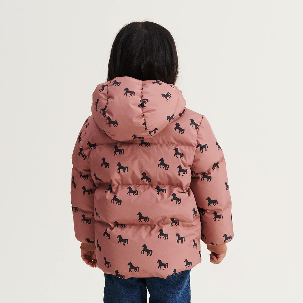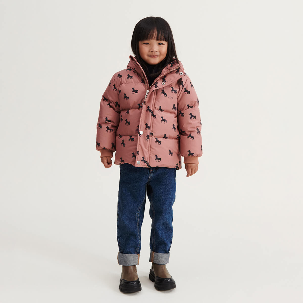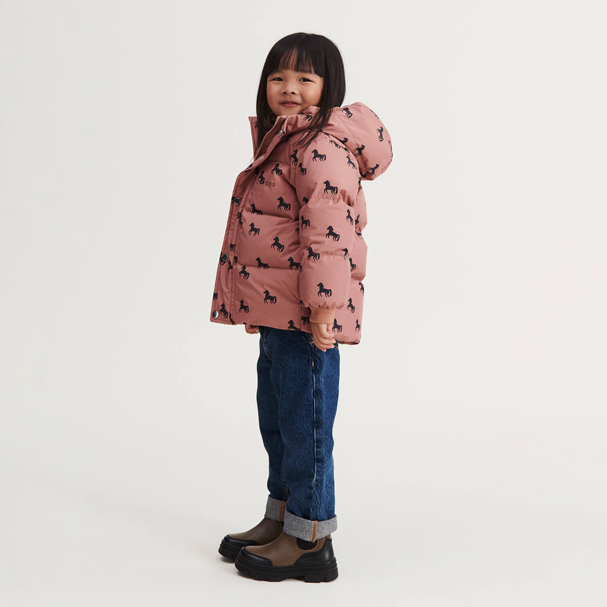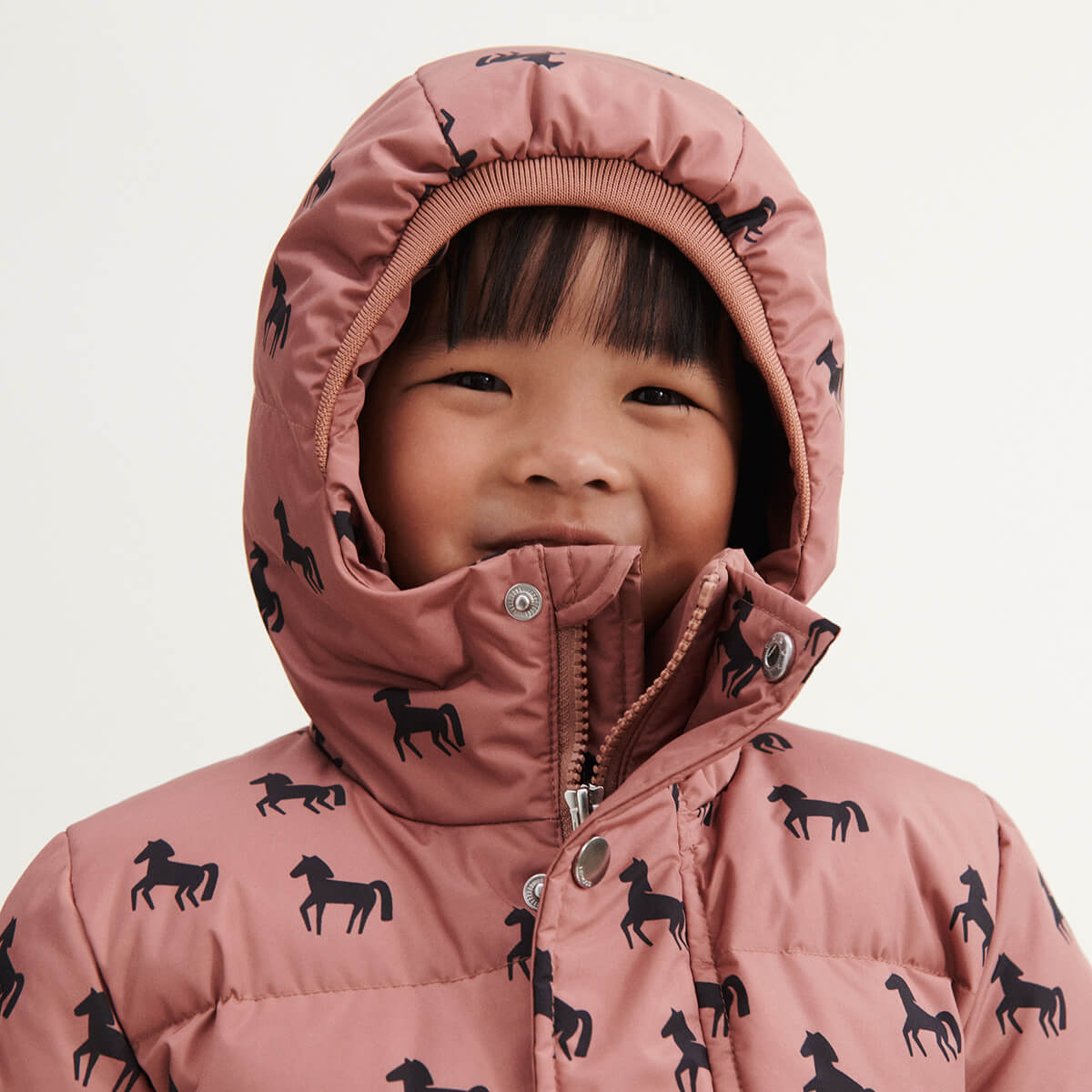 Die horizontalen Steppnähte sorgen für einen modernen Look und eine gleichmäßige Verteilung der Isolierung. Die Kapuze ist zur einfachen Abnahme mit Druckknöpfen an der Jacke befestigt und mit zwei süßen aufgenähten Tierohren verziert. Die Jacke ist mit einem YKK-Reißverschluss und einer verdeckten Klettverschlussleiste ausgestattet, die Fronttaschen sind mit zwei großen Abdeckleisten versehen. An den Ärmelbündchen findet sich einer weicher Rippstrick.