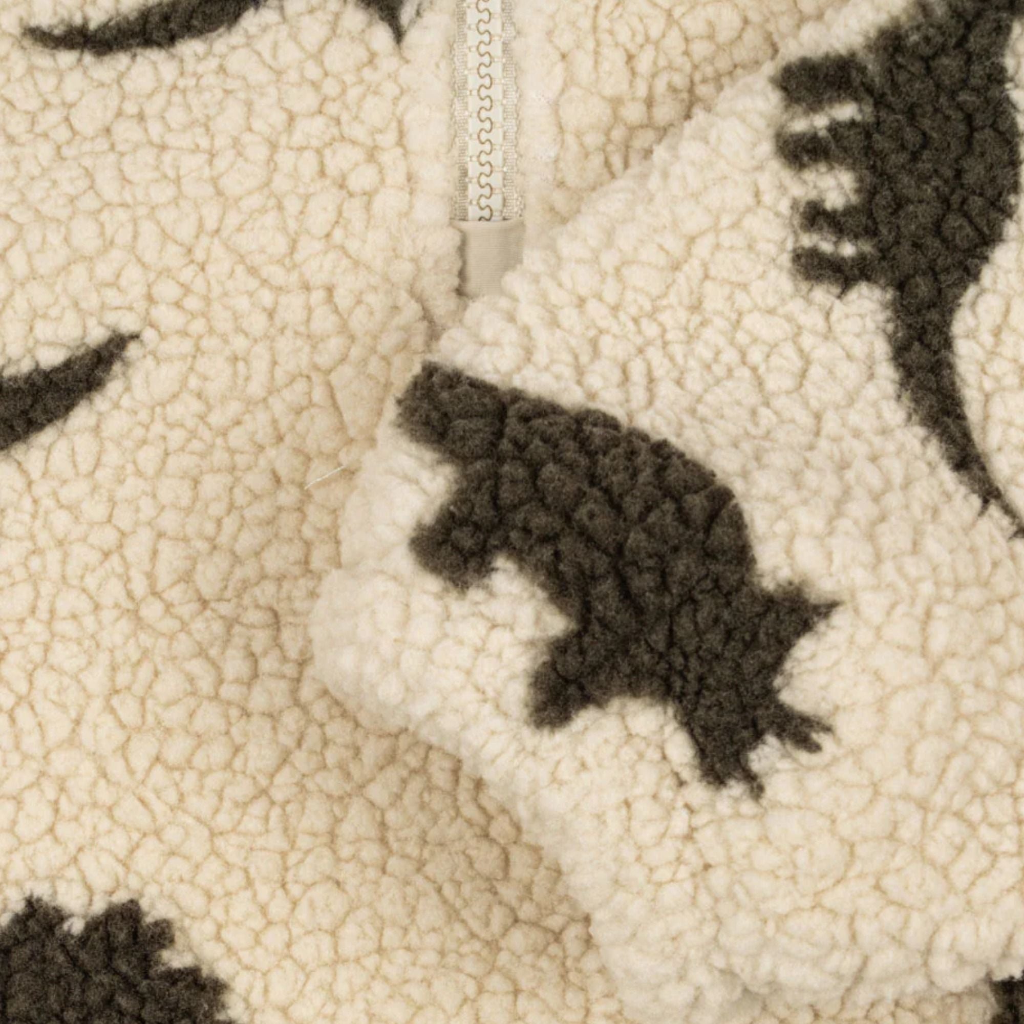 Der Sweater ist aus warmem Teddy-Material gefertigt und hat vorne einen halblangen Reißverschluss mit Stehkragen. Elastische Bündchen an Ärmeln und Saum sorgen für eine bequeme Passform. Das All-Over-Muster macht den Trojer zu einem besonderen Hingucker.