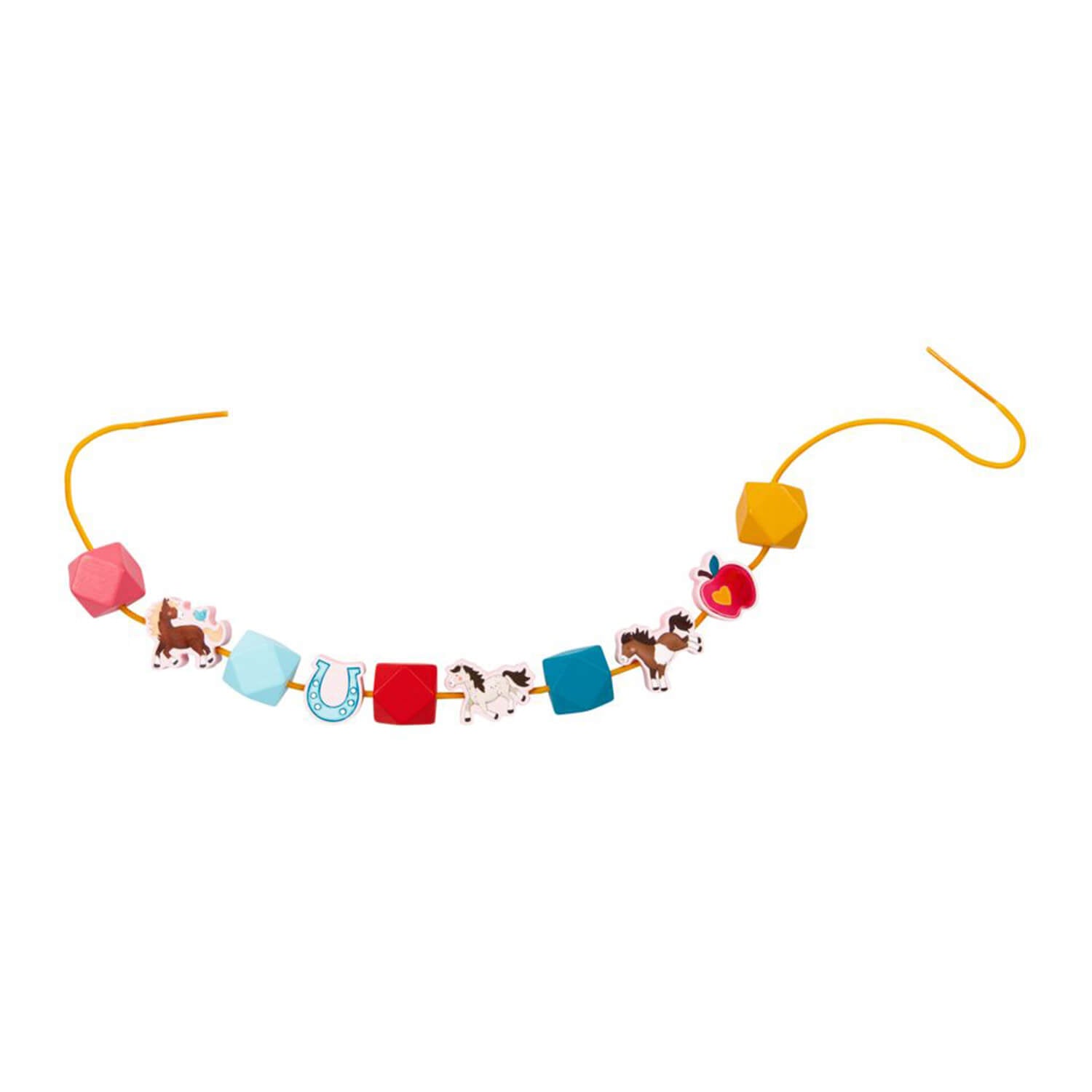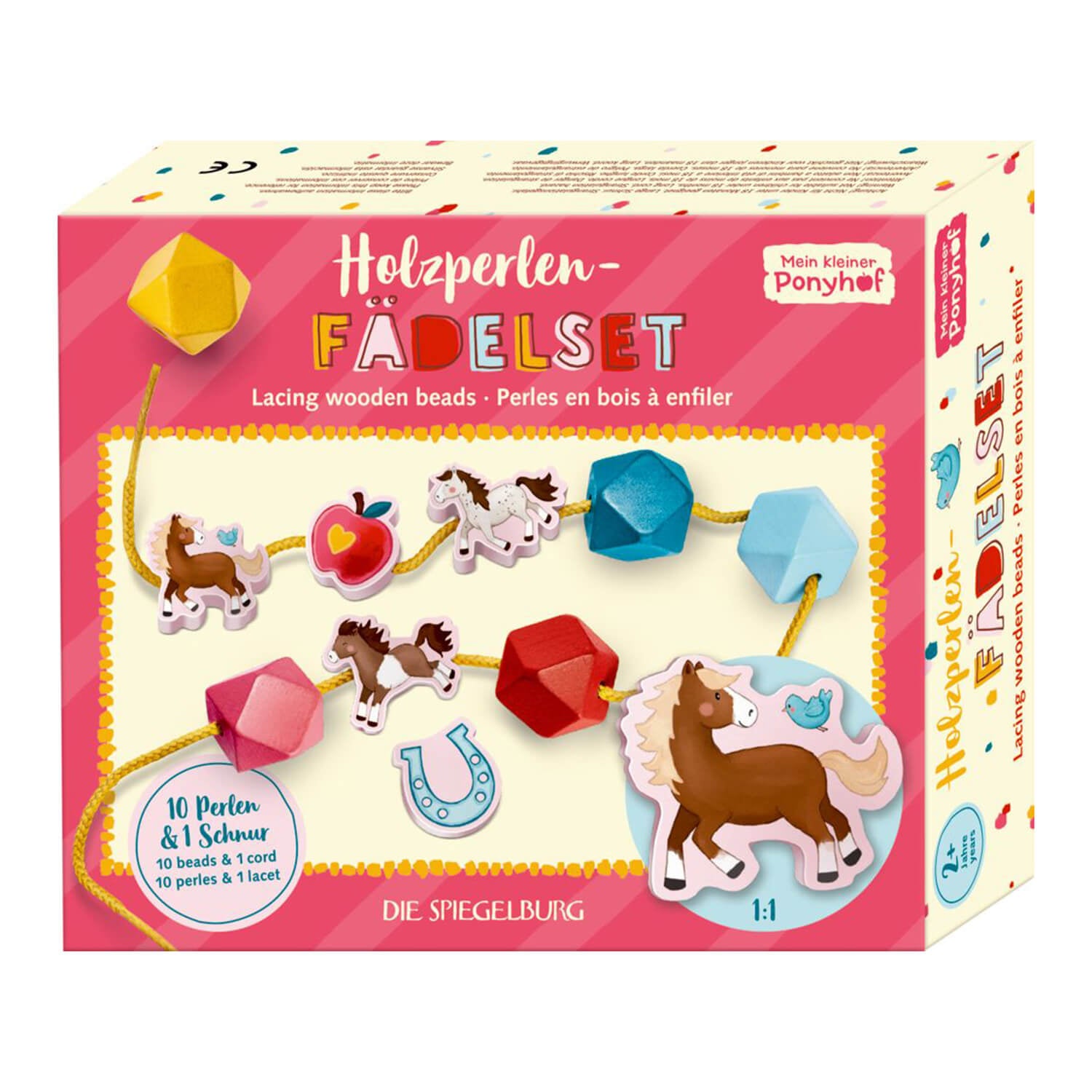 Kreativ-Zeit mit „Mein kleiner Ponyhof": Das pferdestarke Holzperlen-Fädelset besteht aus zehn extra-großen Holzperlen und einer Kordel. Die kunterbunten Perlen sind perfekt für kleine Kinderhände geeignet. Sie sind besonders groß und lassen sich daher leicht greifen und auffädeln. Die Kordel ist ca. 100 cm lang, sodass Kinder genug Spielraum haben, um ihre eigenen Designs zu gestalten. Ob als Armband, Schlüsselanhänger oder Kette - mit dem Holzperlen-Fädelset sind der Fantasie keine Grenzen gesetzt. Die schönen, bunten Perlen mit süßen Ponyhof-Motiven begeistern jeden kleinen Pferdeliebhaber – und schulen ganz nebenbei Feinmotorik und die Hand-Augen-Koordination. Ein kreativer Zeitvertreib für kleine Pony-Fans!