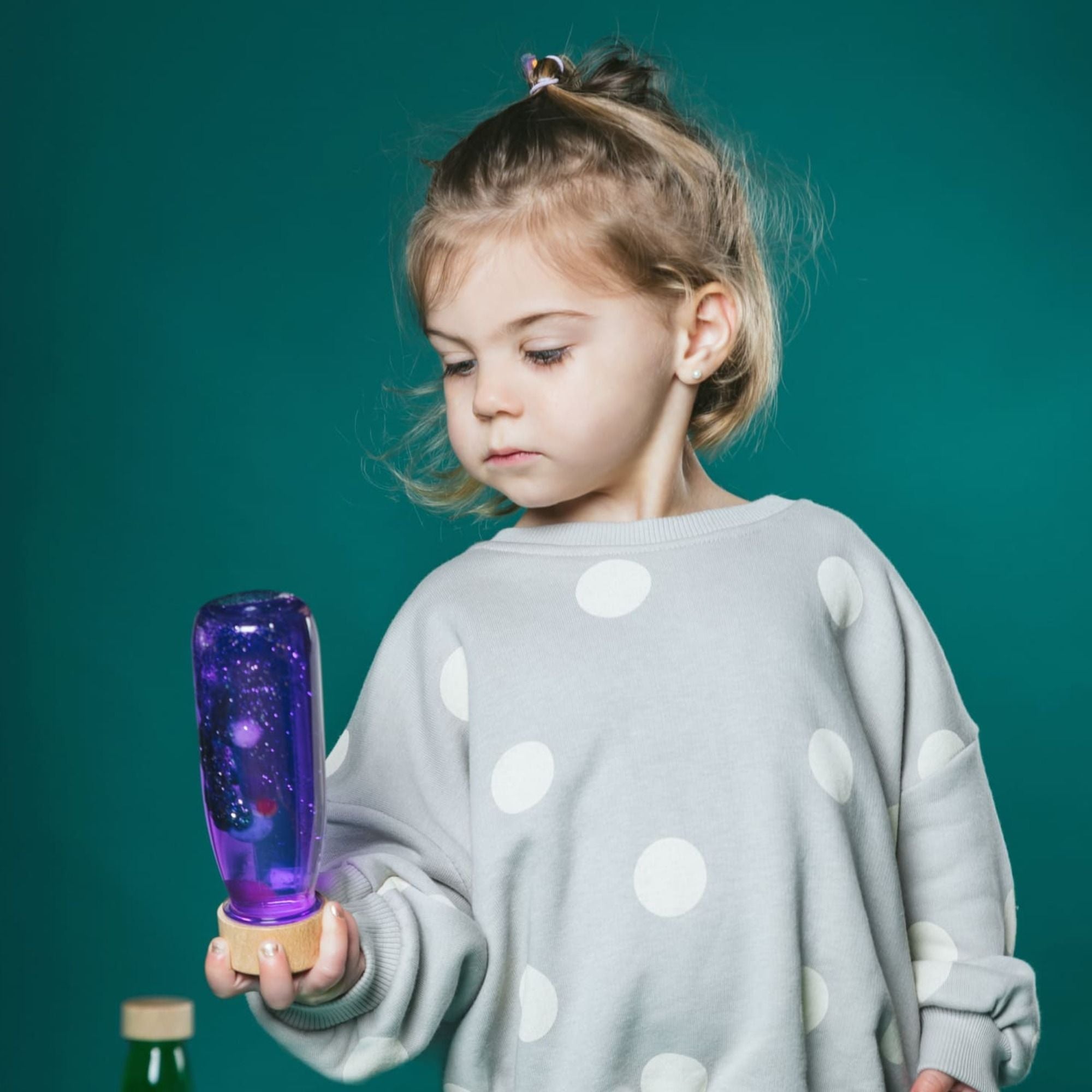 Licht, Farbe und Magie. Mit diesen Flaschen, die von der Farbpalette der Natur inspiriert sind, entdecken Kinder Farben, staunen über das Licht und fördern ihre Konzentration, während sie ihren Moment der Ruhe finden.