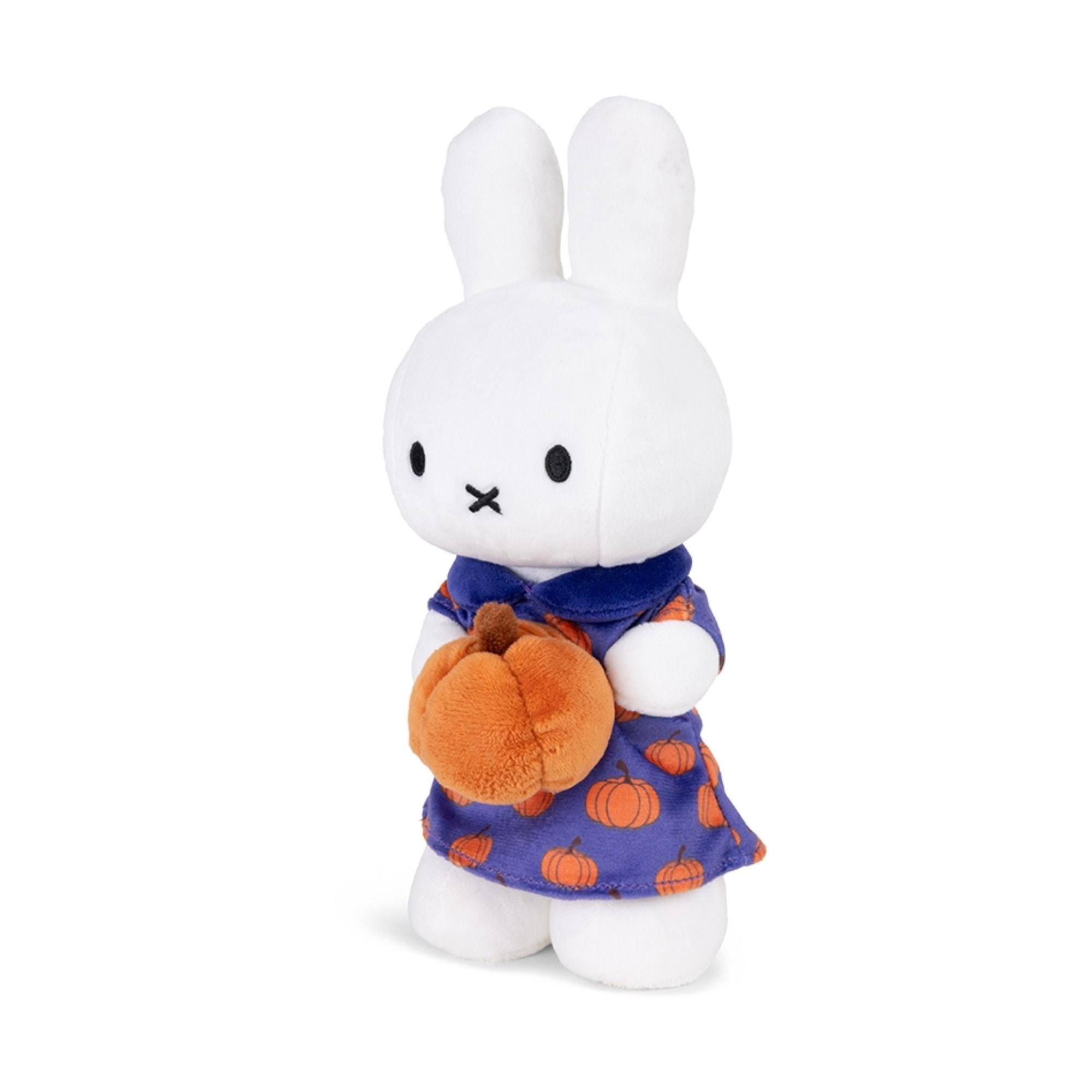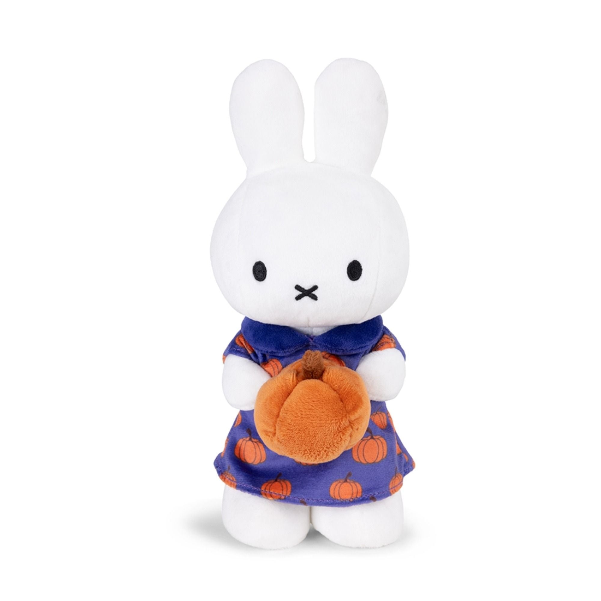 Das ist Miffy mit einem süßen Kleid mit Kürbis-Print und hält dazu einen Plüsch-Kürbis in den Händen.