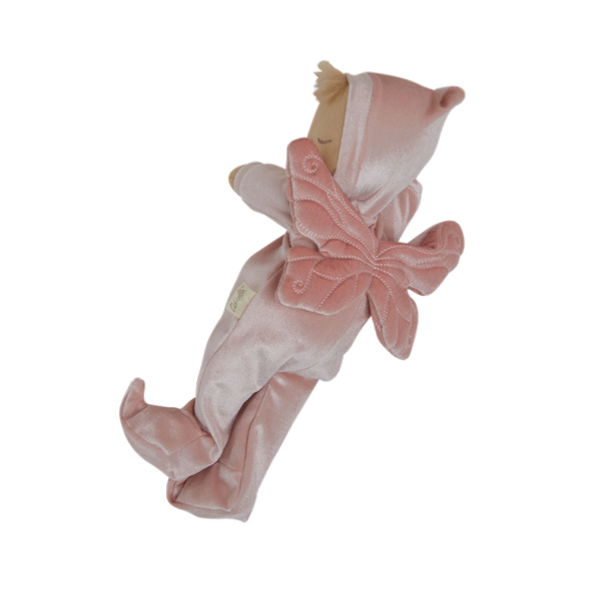 Sie tragen einen weichen Samt-Strampler mit schimmernden Feenflügeln und sind wie geschaffen für kuschelige Momente und traumhafte Abenteuer. Der schlaffe Körper und das sanfte Gewicht machen sie zum perfekten Begleiter für kleine Arme, die sie beim Mittagsschlaf oder Vorlesen festhalten möchten.
