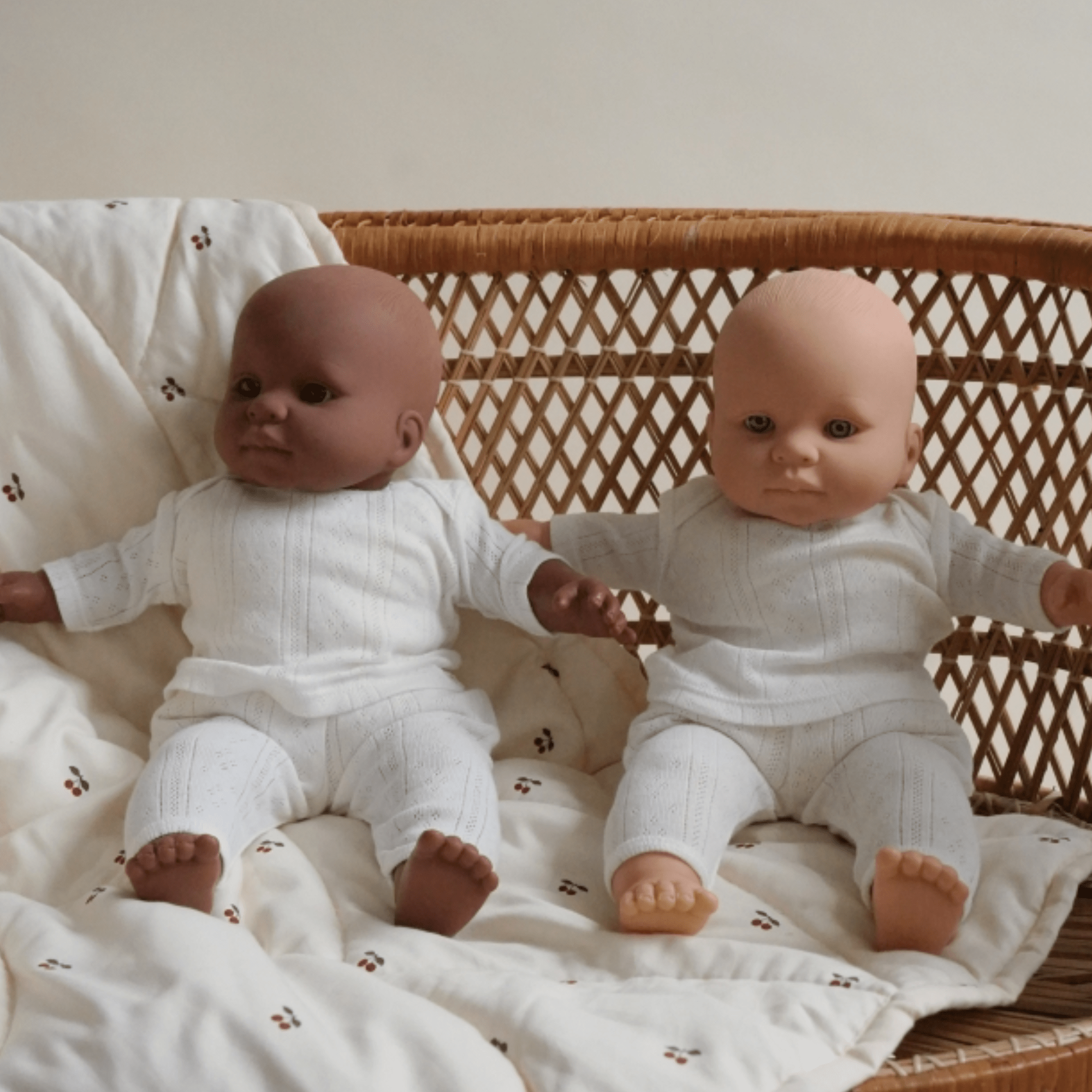 Puppe aus Vinyl mit Bio-Baumwollfasern und einer Füllung aus Recycelpolyester. Pointelle-Hose und -Bluse sind aus 100 Prozent Bio-Baumwolle hergestellt und können vom Kind ganz einfach an- und ausgezogen werden. Die Puppe besitzt sehr realistisch aussehende Augen mit Tiefe und toller Farbgebung.