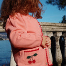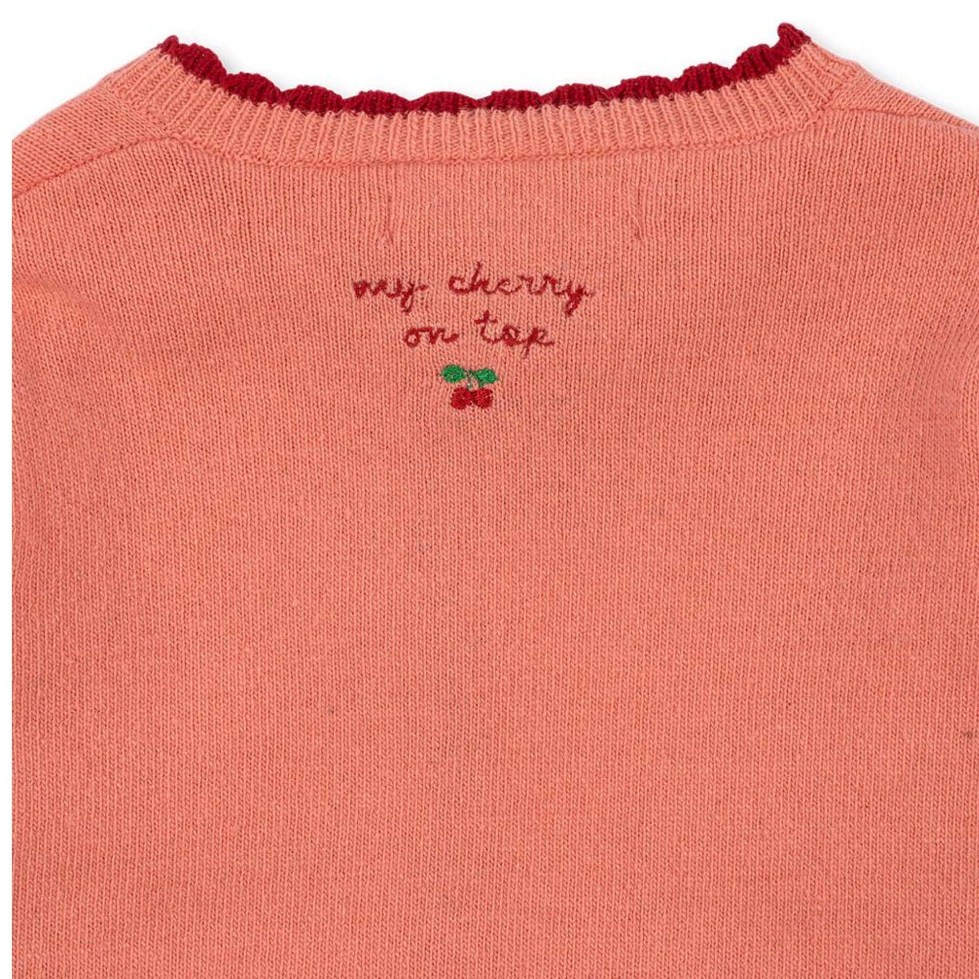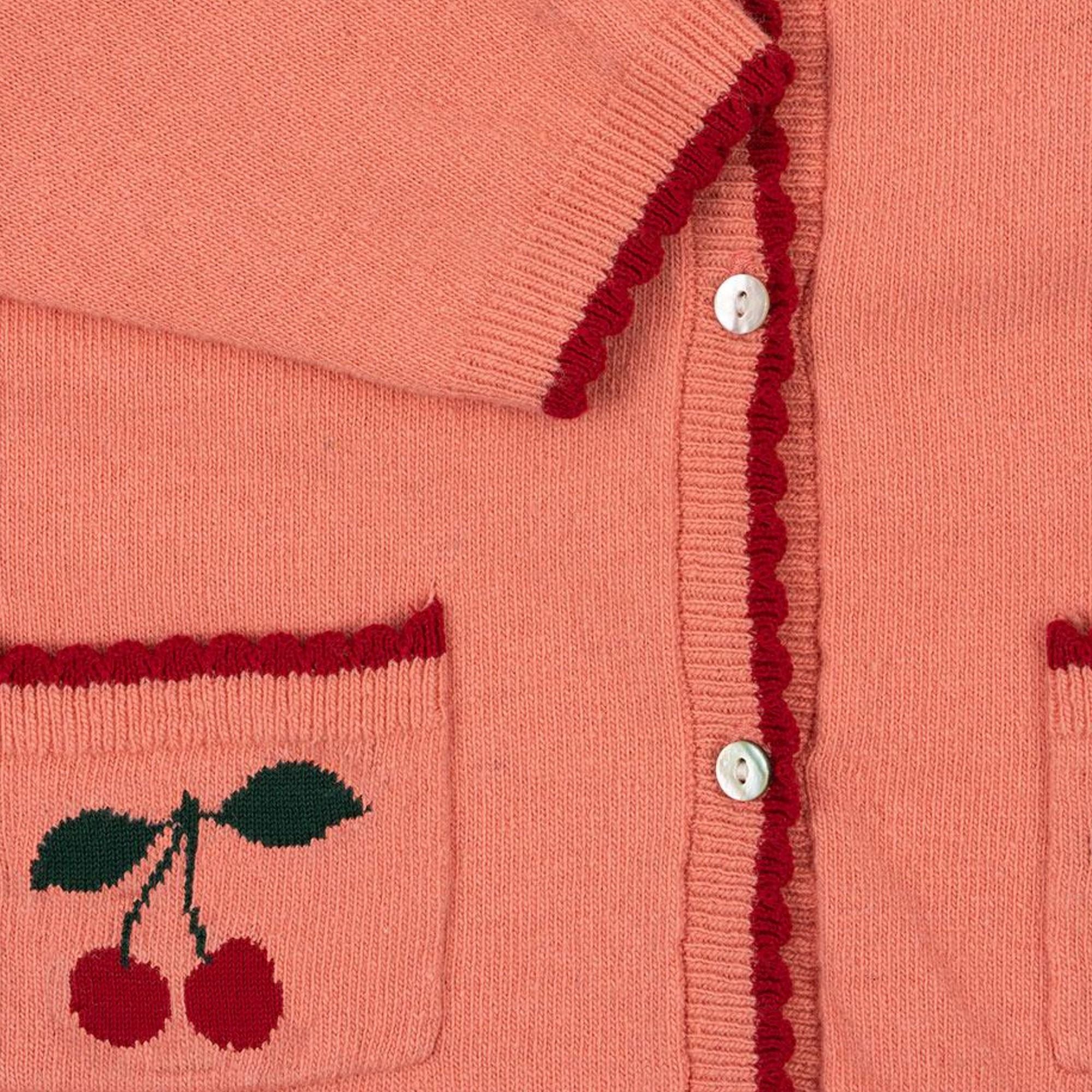 Die Strickjacke ist aus Lammwolle und Bio-Baumwolle hergestellt. Sie ist mit zwei Taschen auf der Vorderseite ausgestattet die von Kirschen verziert sind, was dem Cardigan ein hübsches Aussehen verleiht. Auf der Vorderseite ist der Cardigan mit Knöpfen zu schließen. Die Säume werden von einem Wellenmuster geziert.