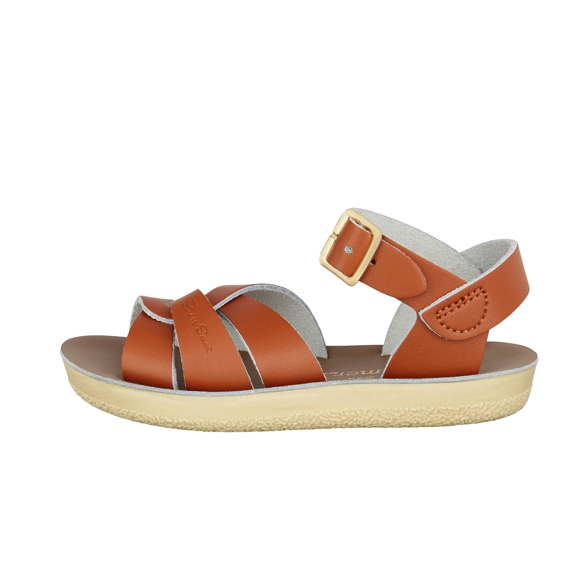 Der Swimmer verfügt über eine Zehenpartie aus gewebtem Leder mit einem Knöchelriemen mit Schnalle zur einfachen Anpassung. Basierend auf dem ursprünglichen Salt-Water Sandals Design, das es seit den 1940er Jahren gibt, ist der Sun-San Swimmer auf einer ledergefütterten Urethansohle gepolstert und passt sich bei wiederholtem Tragen dem Fuß des Benutzers an. Die Sun-San Swimmer sind ideal für gemeinsame Zeit mit Ihrem Kleinen am Strand.