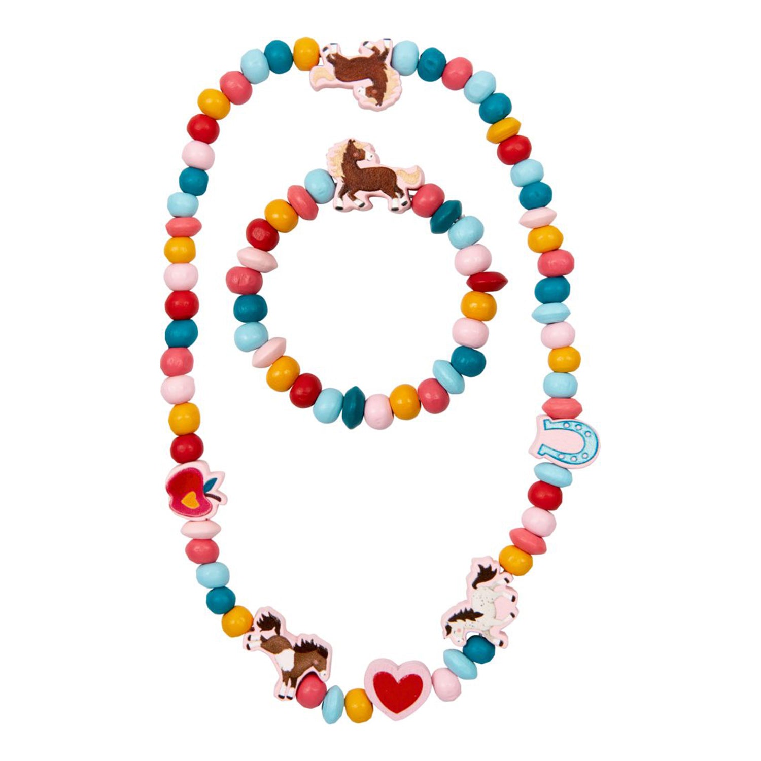 Mein kleiner Ponyhof: Für kleine Pferdefans ist dieses bezaubernde Schmuckset von Die Spiegelburg genau das Richtige! Das Set besteht aus einer elastischen Kette und einem Armband, die beide mit kunterbunten Holzperlen in verschiedenen Motiven verziert sind. Der Holzanteil des Sets stammt aus nachhaltiger Forstwirtschaft und bietet somit ein umweltfreundliches Accessoire für Kinder. Die Kette hat eine Länge von ca. 20 cm und das Armband einen Durchmesser von ca. 5 cm, perfekt für kleine Handgelenke. Ein hübsches Geschenk für kleine Pferdefreunde.
