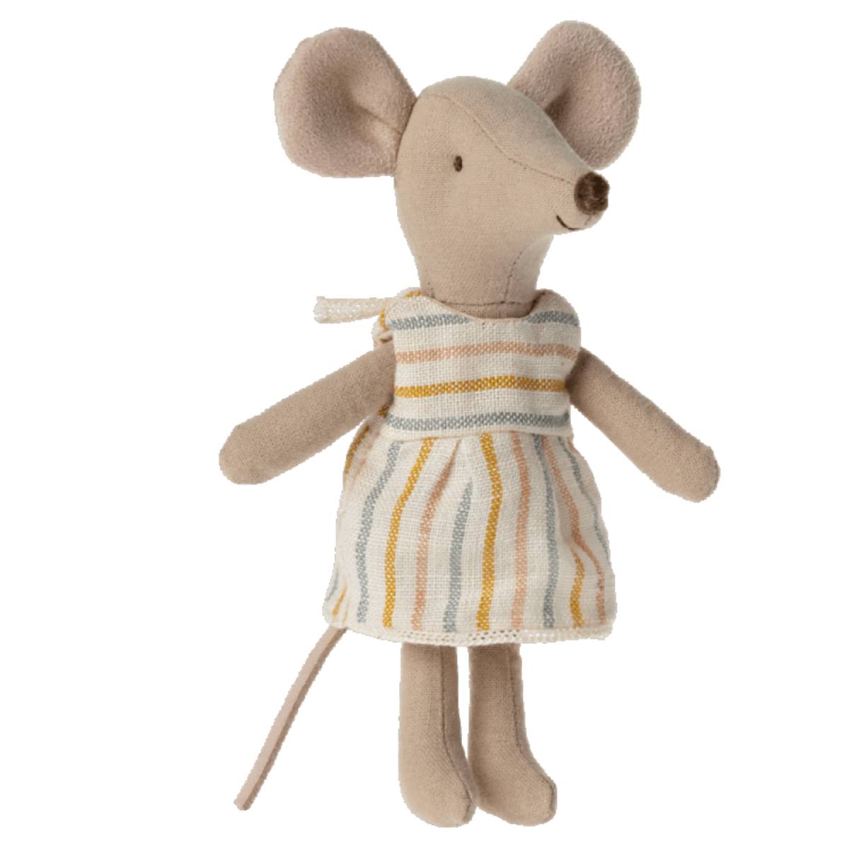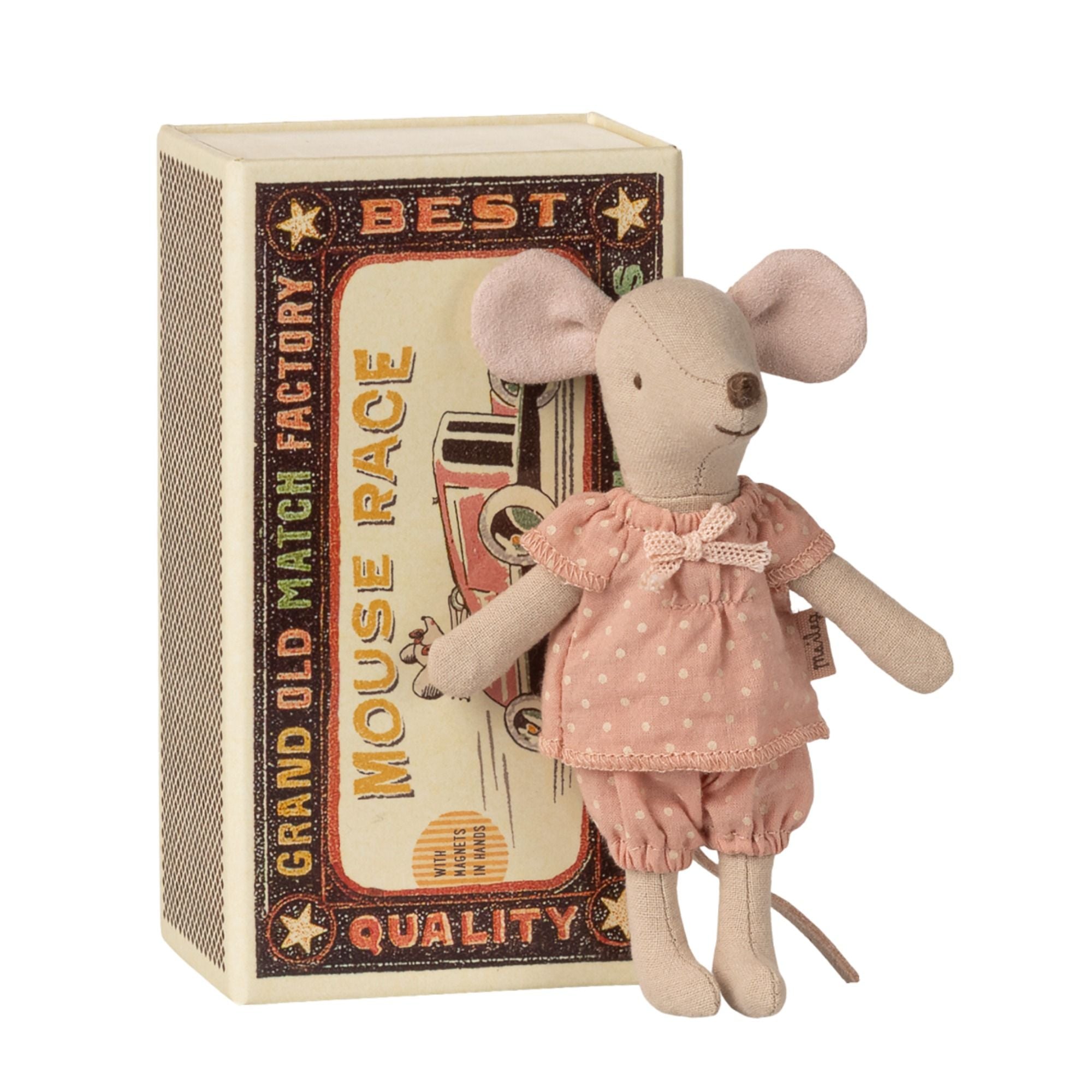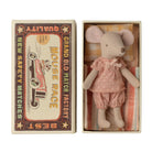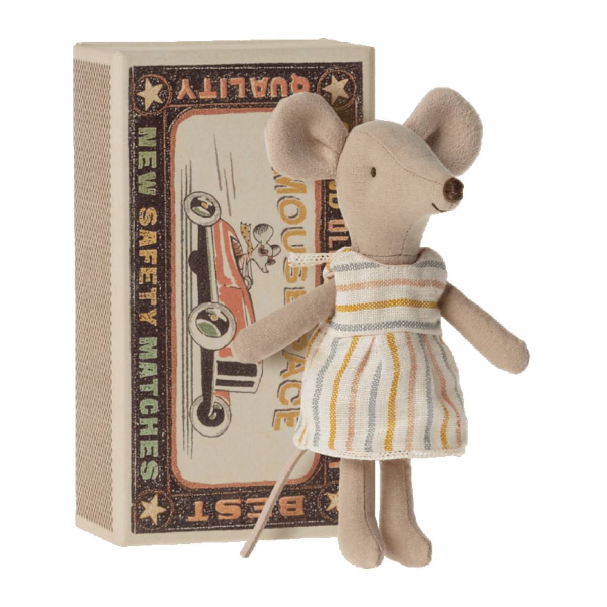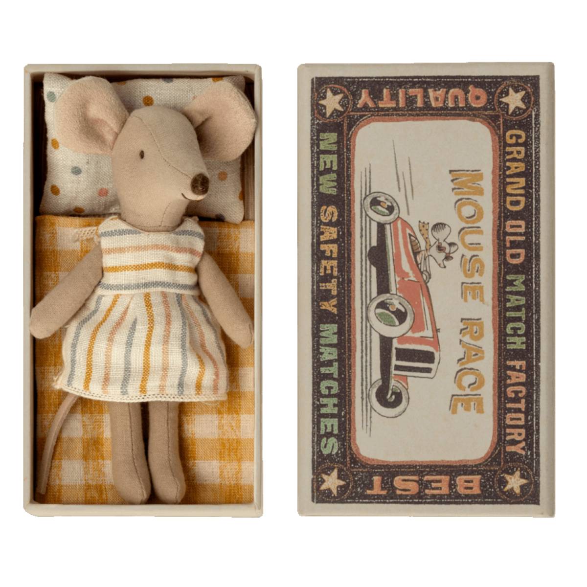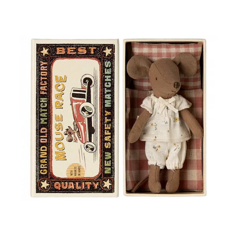 Ein klassischer Maileg Artikel. Diese Maus ist bereit für stundenlanges Spielen und schläft gut in einer kleinen Streichholzschachtel. Die Kleidung und Bettwäsche sind aus weichen Stoffen mit einzigartigen Drucken und schönen Farben.