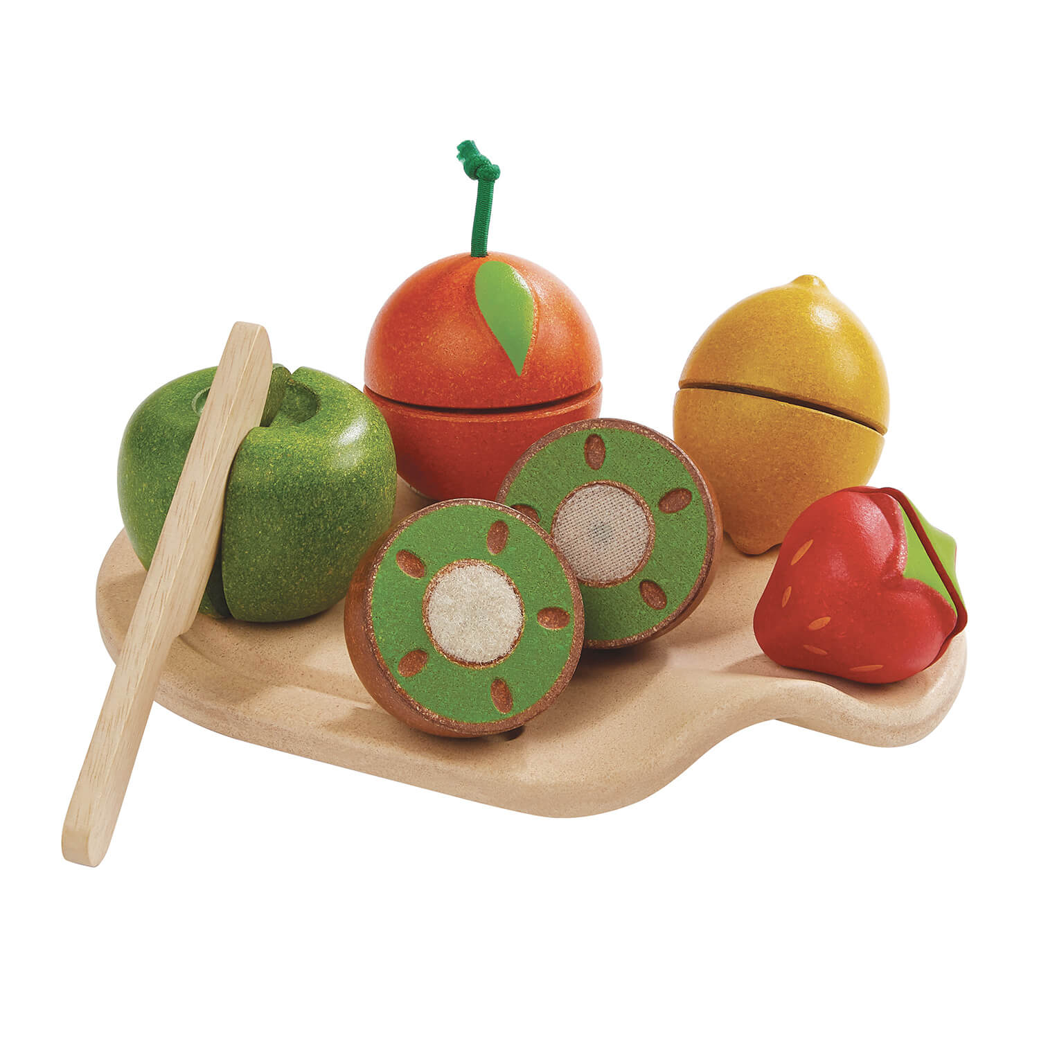 - Obst-Set: 1 Orange, 1 Zitrone, 1 Kiwi, 1 Erdbeere, 1 Apfel, 1 Messer und ein Schneidebrett