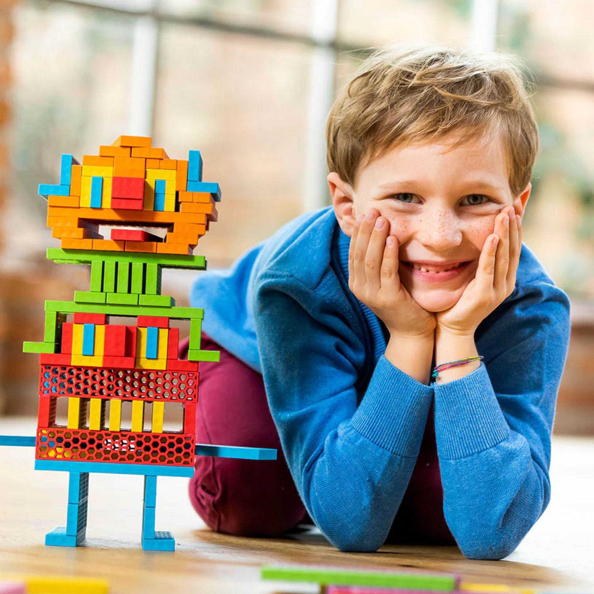 Bioblos werden auf-, neben-, hinter- oder übereinander gestellt. Hingelegt. Angelehnt. Aufgetürmt. Ausbalanciert. Ganz ohne Kleber, ganz ohne Verbindungsstücke. Und obwohl das manchmal recht wackelig aussieht, sind selbst die höchsten Türme und Brücken erstaunlich stabil. Alles, was es dazu braucht, ist ein wenig Geduld und Geschicklichkeit!