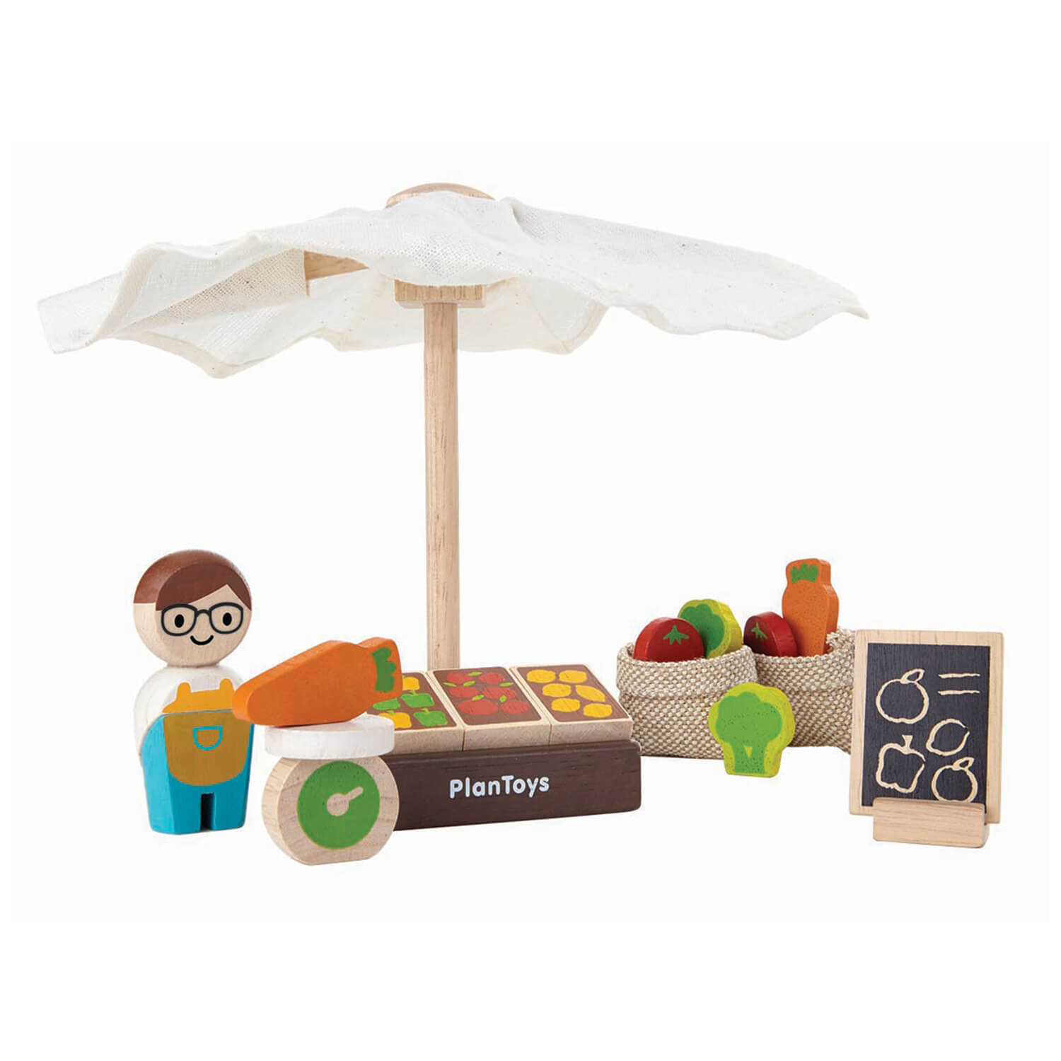 Holen Sie sich frisches Obst und Gemüse aus dem Garten eines Bauern! Das PlanToys Market-Set hat alles, was ein Kind braucht, um einen Stand für den Bauernmarkt aufzubauen.
