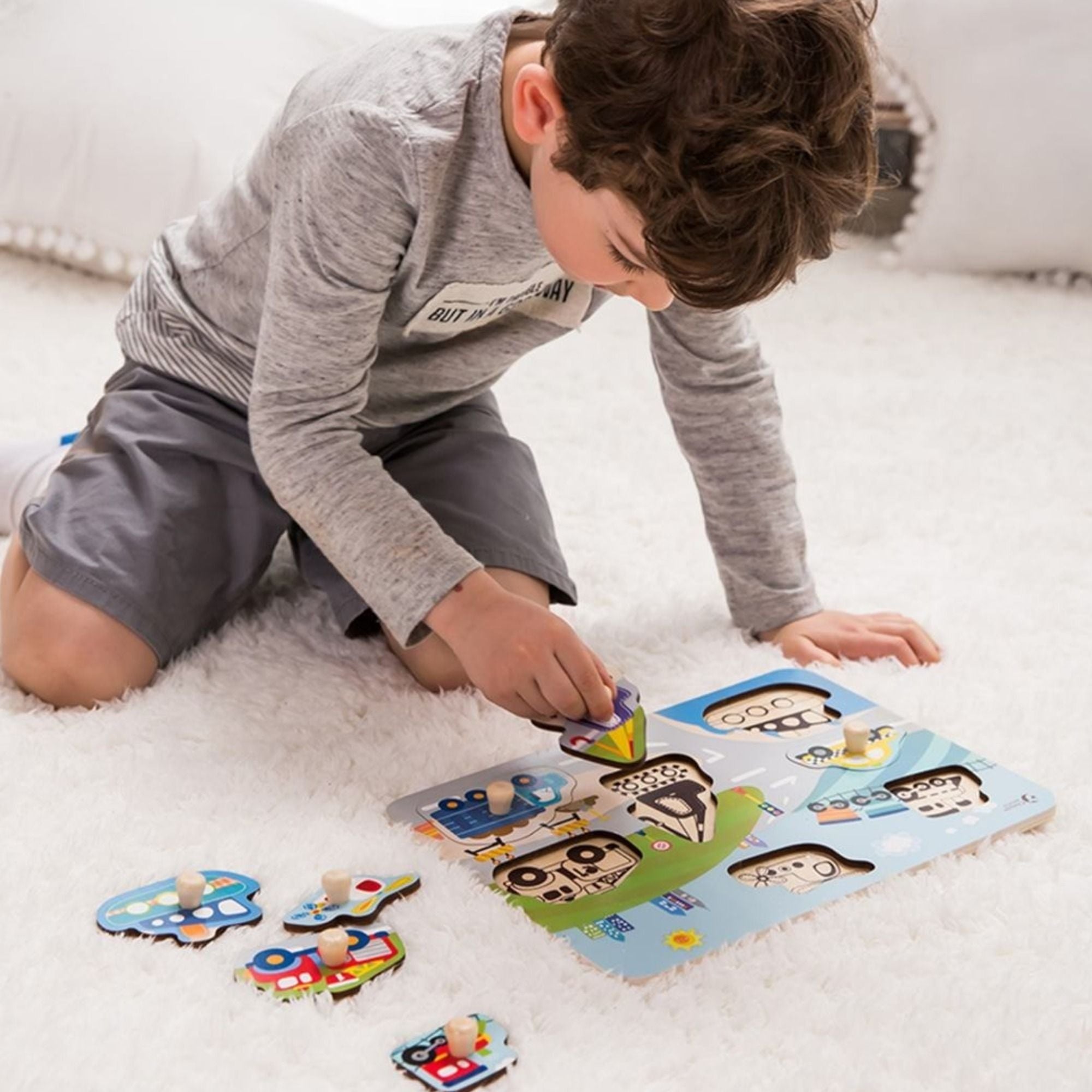 Steckpuzzle aus Holz mit 7 Teilen für Kleinkinder ab 18 Monaten. Die Puzzleteile sind mit Holzgriffen ausgestattet, sodass sie sehr einfach zu greifen sind. Das Zuordnen der bunten Fahrzeuge fördert die Hand-Auge-Koordination und Feinmotorik.