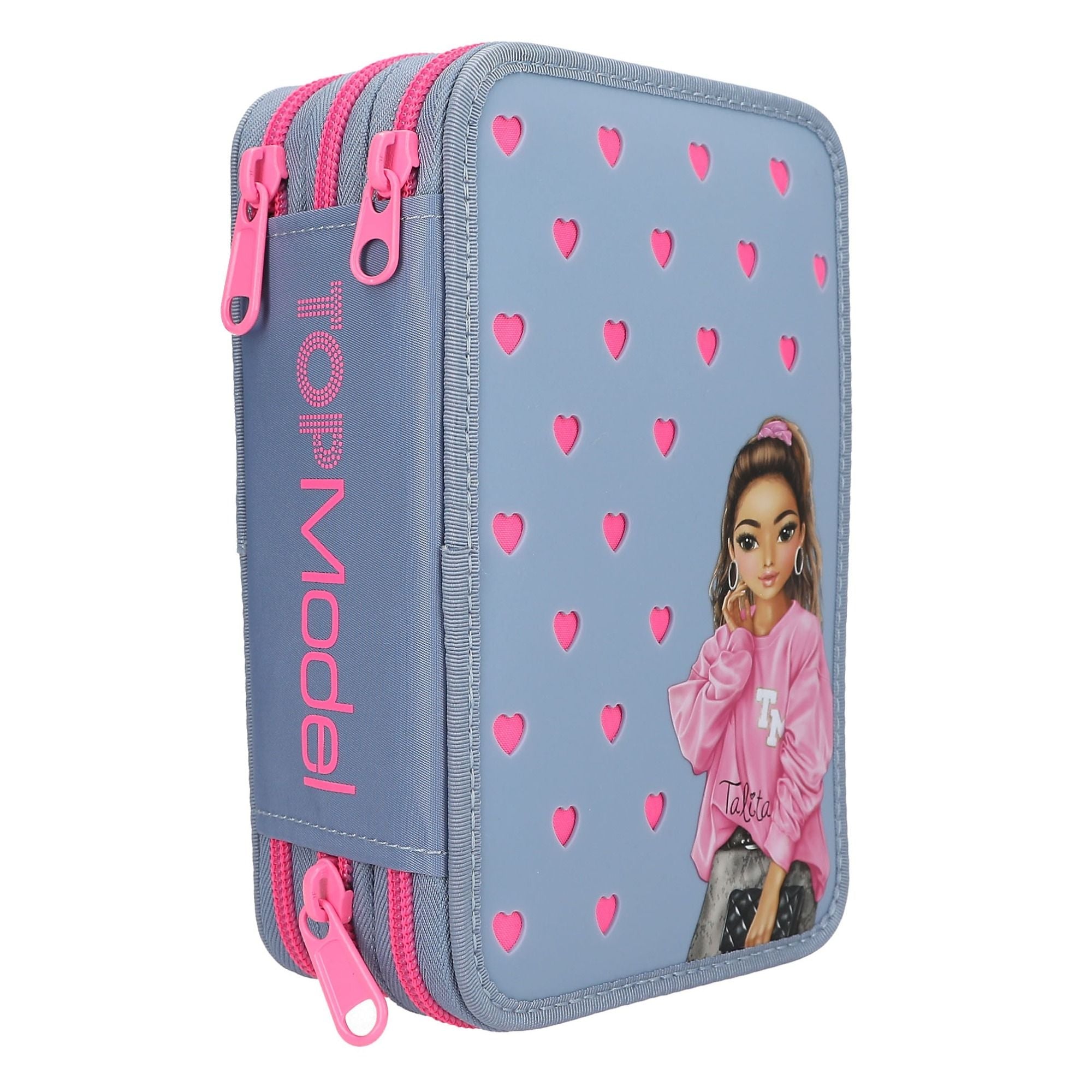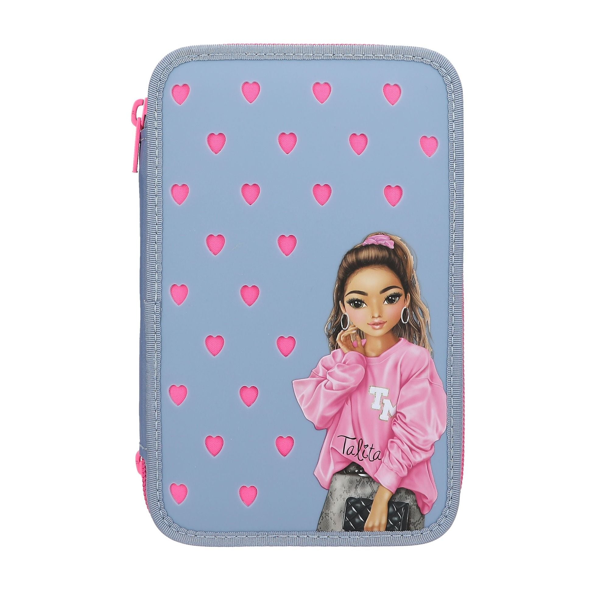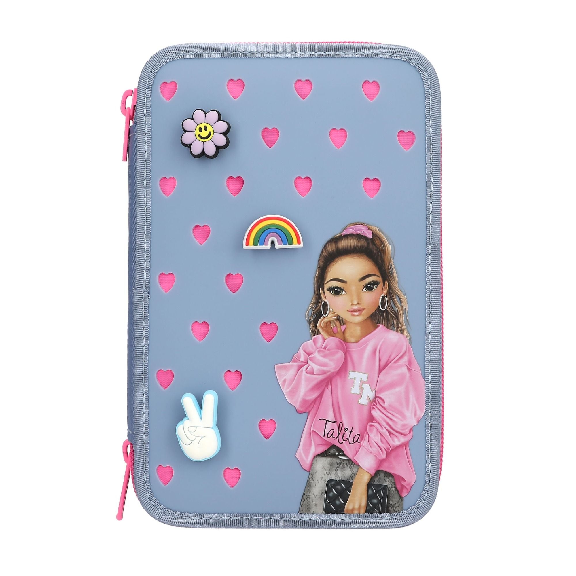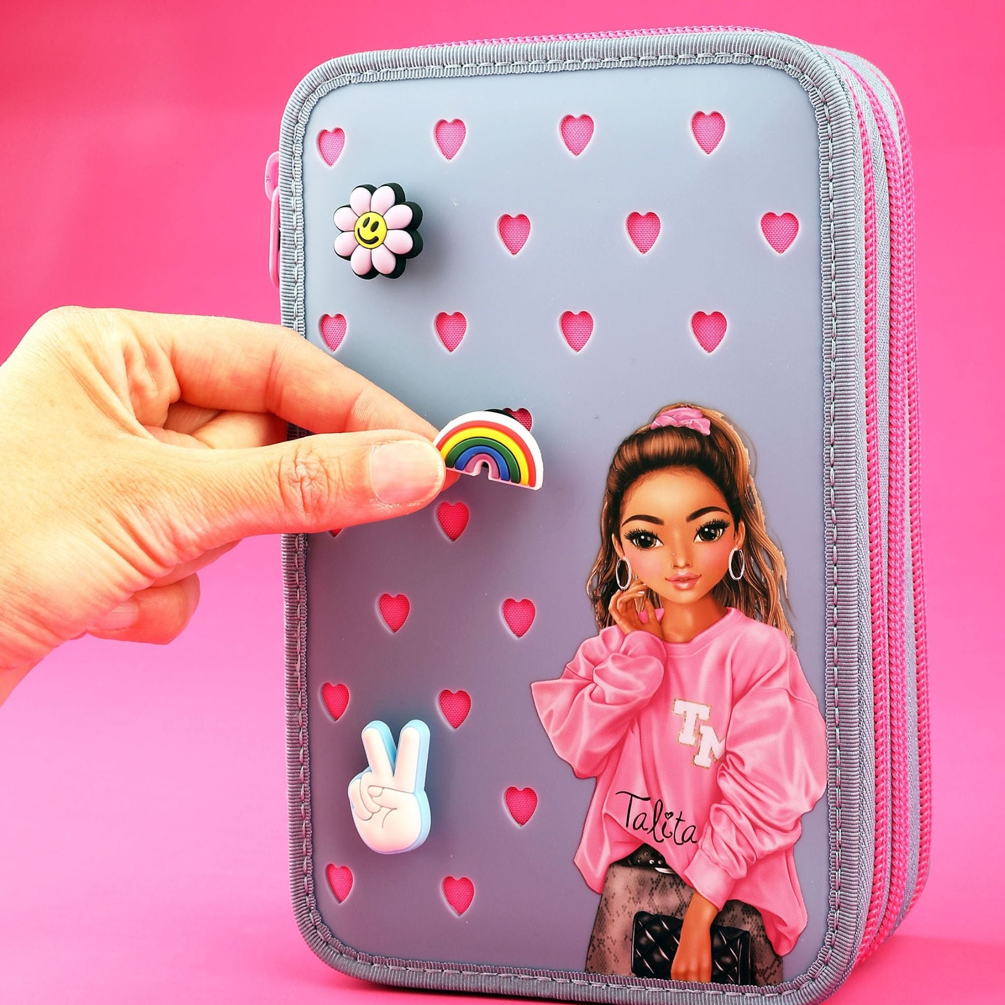 Pin-Power! Die mittelblaue TOPModel-Federtasche hat auf der Front herzförmige Aussparungen, in denen Pins fixiert werden können. 3 niedliche Pins sind schon dabei! Mit coolem Model-Motiv und neonpinken Details. Die drei separaten Reißverschlussfächer sind komplett gefüllt mit je 18 Bunt- und Filzstiften, 2 Bleistiften, Anspitzer, Radierer, Lineal, Klebestift, Schere und einem kleinen Kletttäschchen.