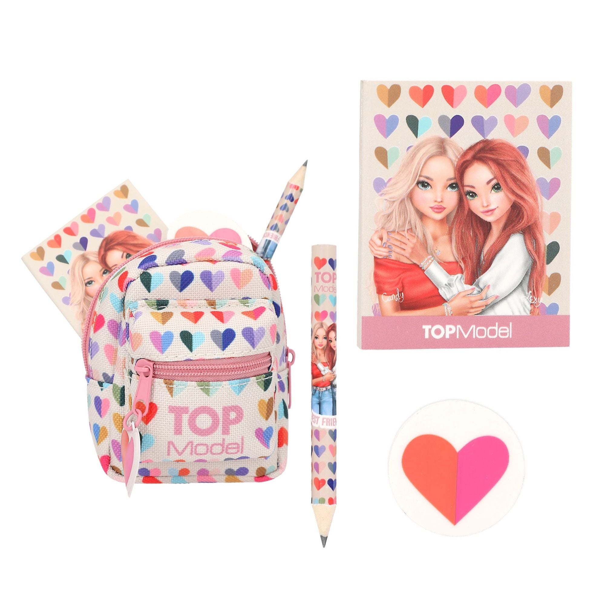 In den Mini-Rucksäcken von TOPModel steckt alles, was man zum Notizenmachen braucht: 1 kleiner Bleistift, 1 runder bedruckter Radierer und 1 süßes Notizbuch. Alles passend zum Rucksack-Design gestaltet. Zwei Designs erhältlich: im angesagten Leo-Look und mit hübschen, zweifarbigen Herzen. Die kleinen Rucksäcke haben einen Karabiner zum Anhängen z.B. an Taschen oder am Schlüsselbund.