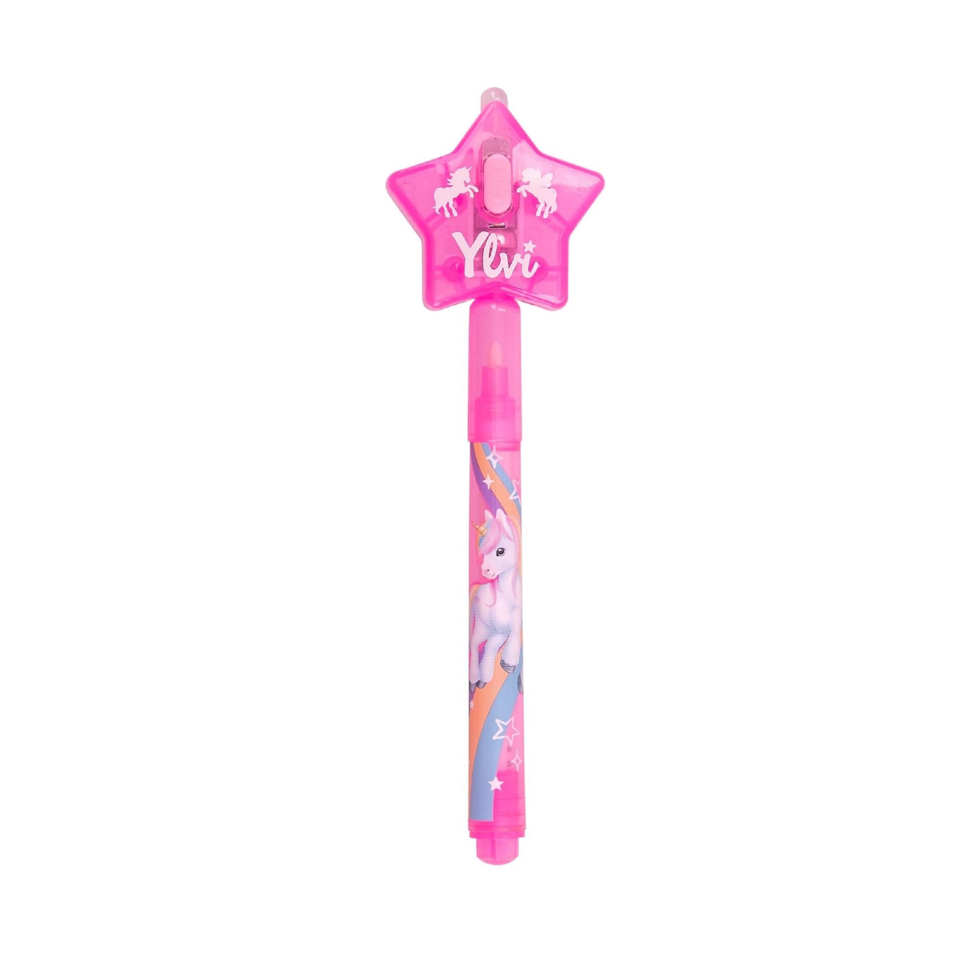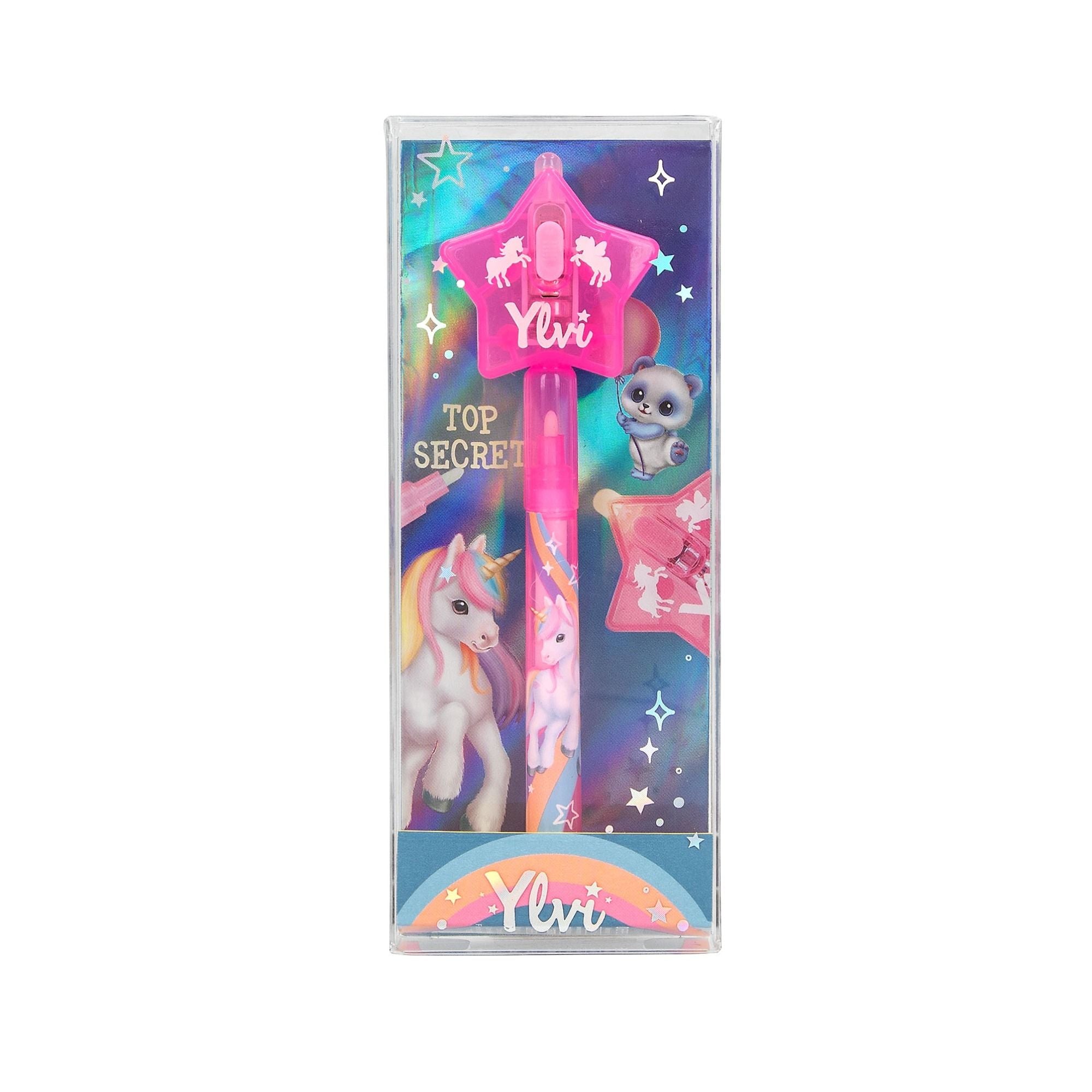 Der pinke Stift für geheime Botschaften von Ylvi schreibt mit unsichtbarer Tinte, die erst sichtbar wird, wenn man sie mit dem UV-Licht des Stern-Toppers beleuchtet. Mit tollen Einhorn-Prints auf dem Stift. Batterien sind enthalten, aber nicht austauschbar.