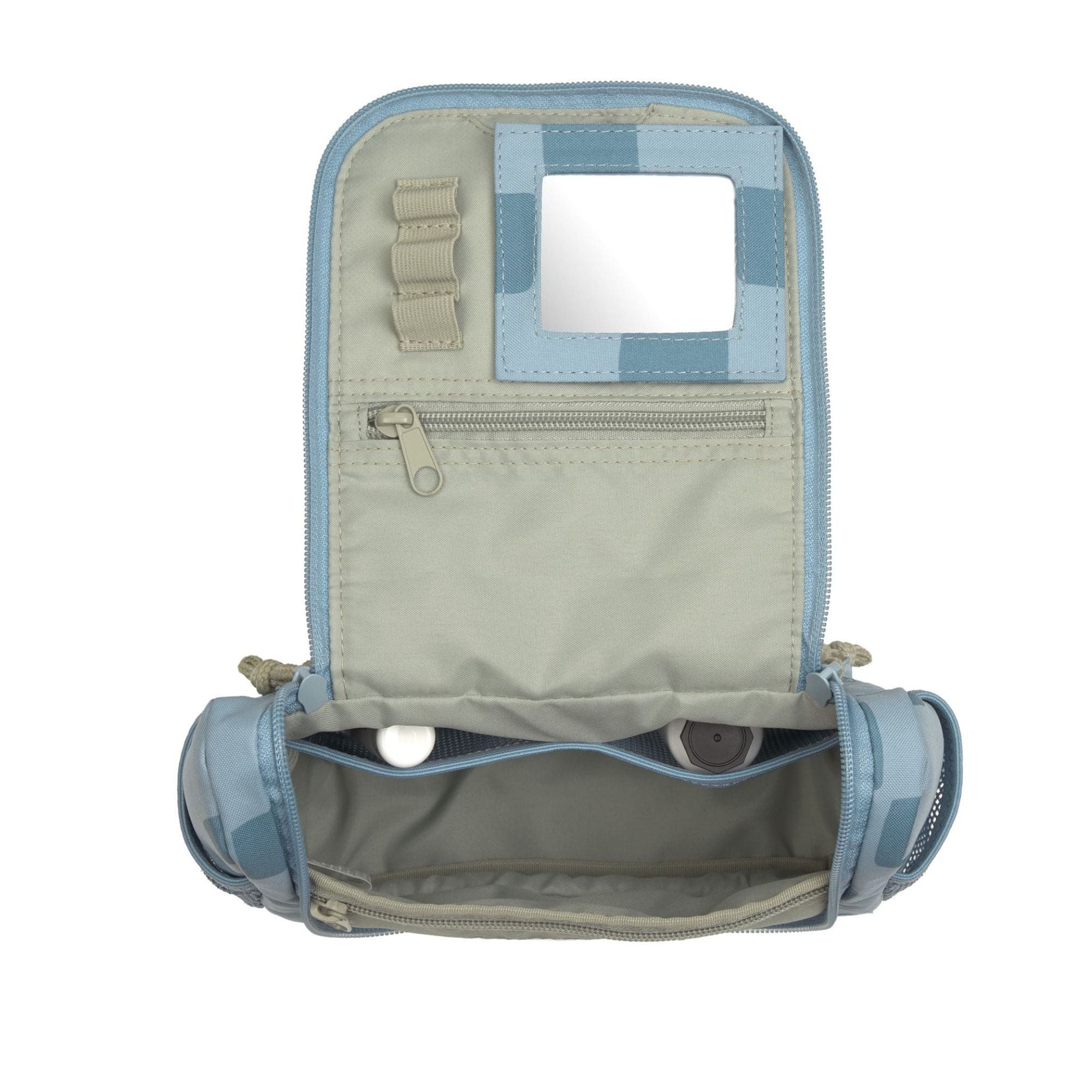 Der Kulturbeutel ist der perfekte Begleiter für Reisen und Übernachtungsausflüge. Mit seinem wasserabweisenden, leichten und robusten Material schützt er den Inhalt zuverlässig vor Feuchtigkeit. Das übersichtlich gestaltete Hauptfach bietet ausreichend Platz für Seife, Duschgel, Creme und eine Haarbürste. Zahnbürste, Zahnpasta und kleine Accessoires lassen sich ordentlich in zwei Netzfächern und separaten Reißverschlussfächern verstauen. Ein abnehmbarer Spiegel sowie ein praktischer Haken zum Aufhängen sorgen für zusätzlichen Komfort unterwegs. Auf der Innenseite befindet sich ein Namensschild zur individuellen Kennzeichnung. Für eine persönliche Note lässt sich der Kulturbeutel mit farbenfrohen, austauschbaren Patches gestalten – ein Patch ist bereits enthalten.