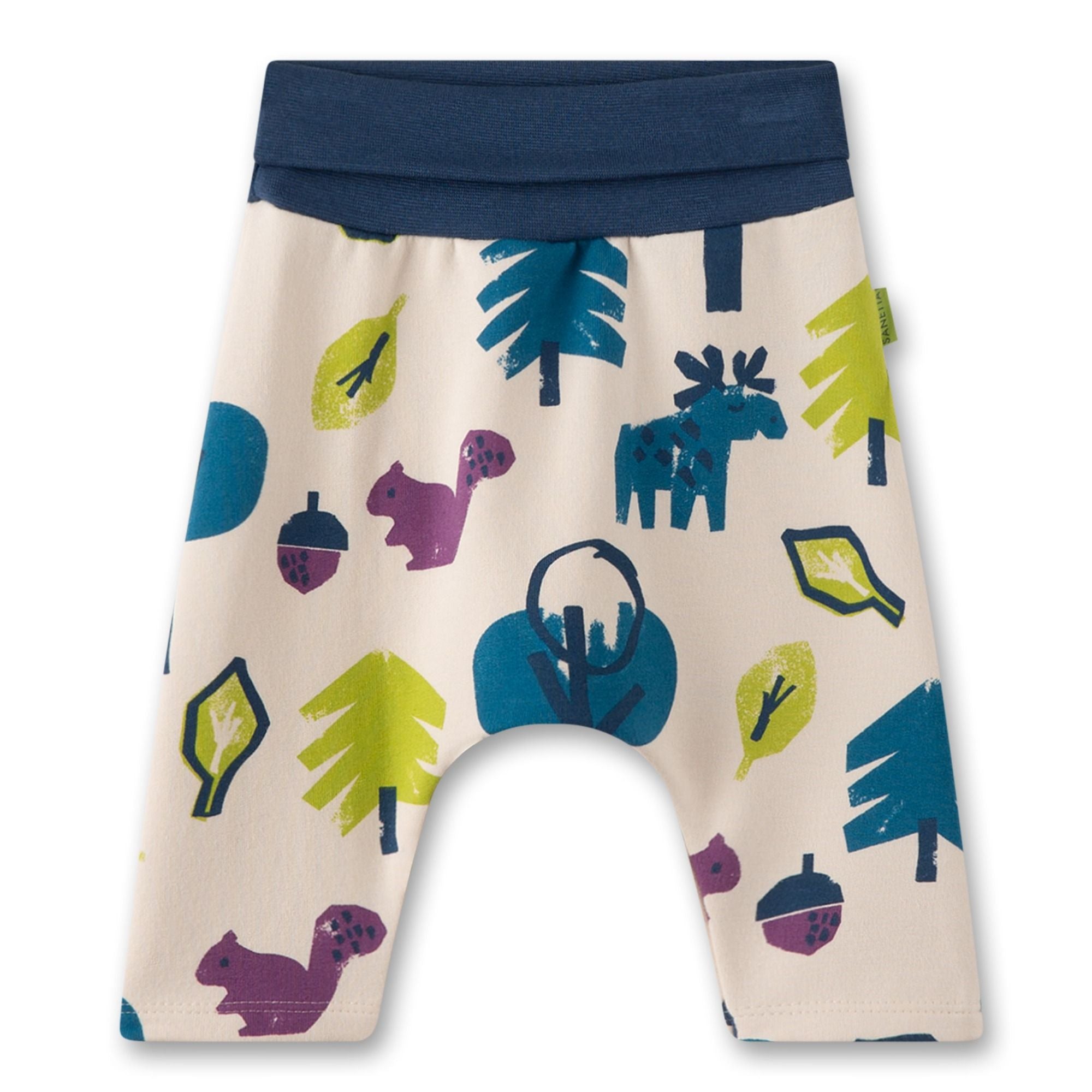 Durchdachtes Design: Ein praktisch anpassbarer Umschlagbund und die lockere Passform ohne Mittelnaht sorgen für Bequemlichkeit. Der Beinabschluss mit Saum und der Natur-Allover-Print mit Elchen, Eichhörnchen, Haselnüssen und Bäumen machen die Hose besonders attraktiv.