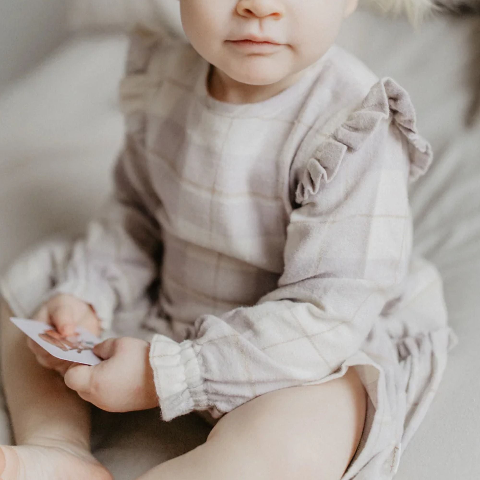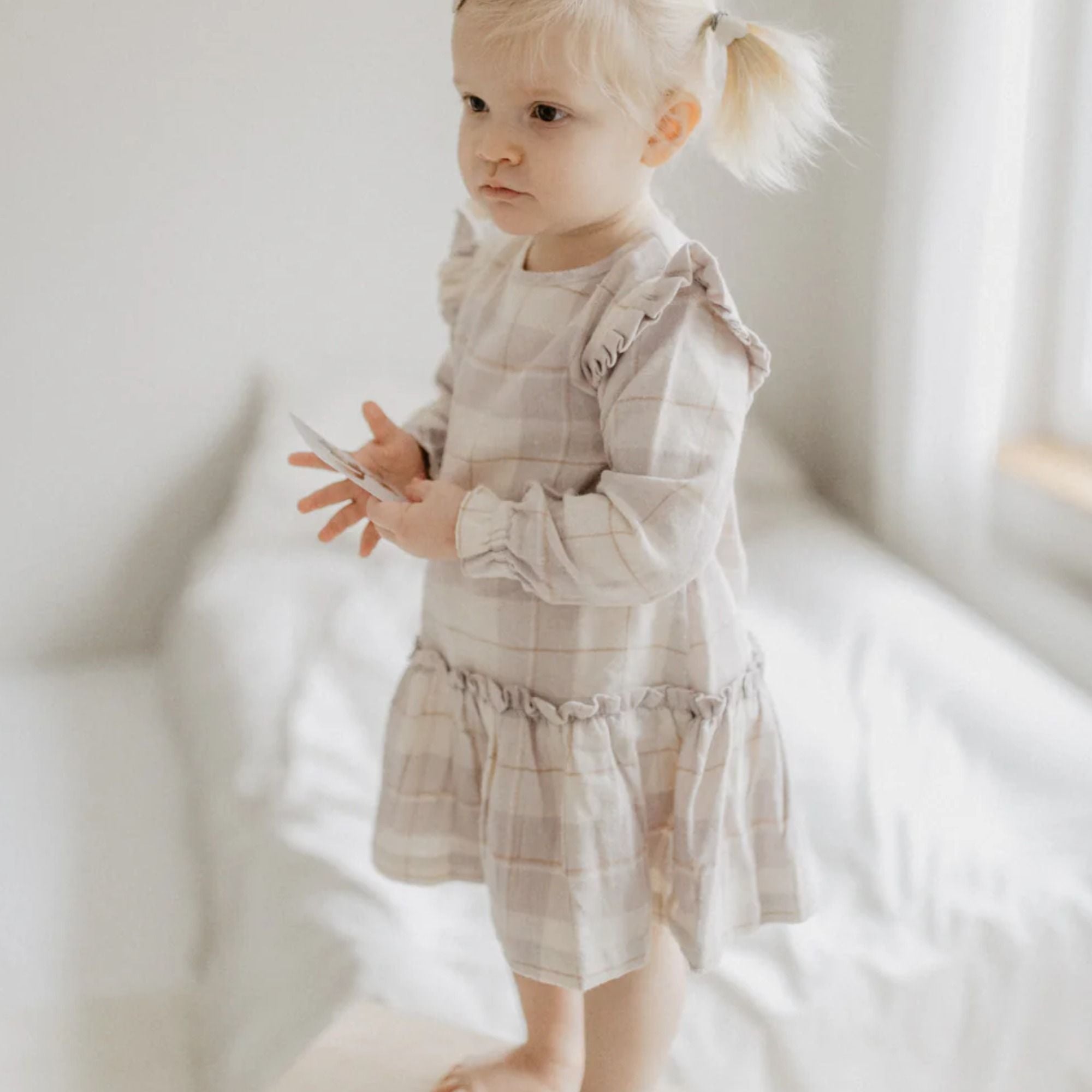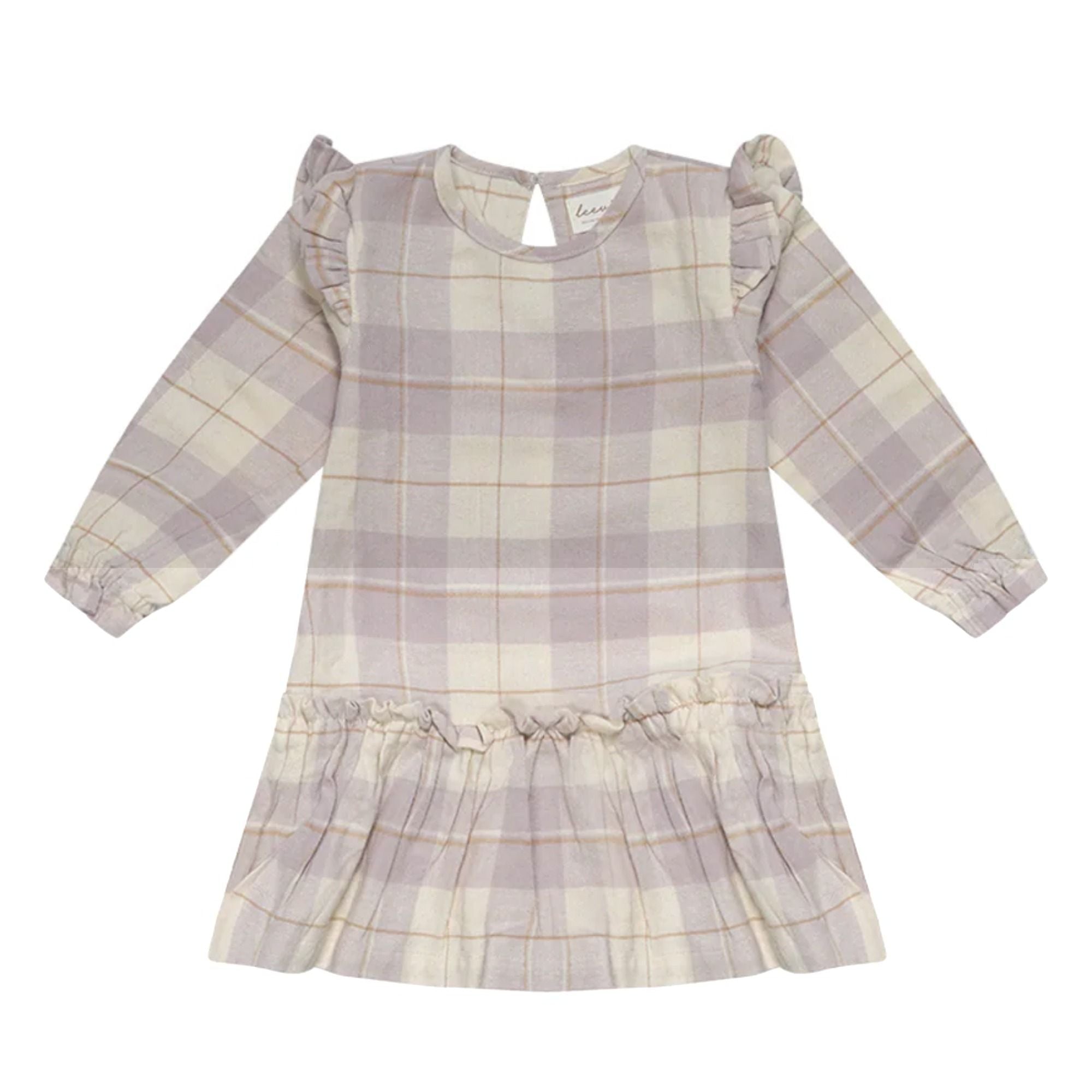 Dieses zauberhafte Langarmkleid aus weichem, gebürstetem Flanell bietet ein besonders angenehmes Tragegefühl und besticht durch liebevolle Details. Das zarte Karo in Lavendel und Beige verleiht dem Kleid eine harmonische Optik, während die Rüschen an den Schultern eine feminine Note setzen. Ein Knopfverschluss auf der Rückseite erleichtert das An- und Ausziehen, und der gerüschte Saum am unteren Kleid rundet das verspielte Design stilvoll ab.