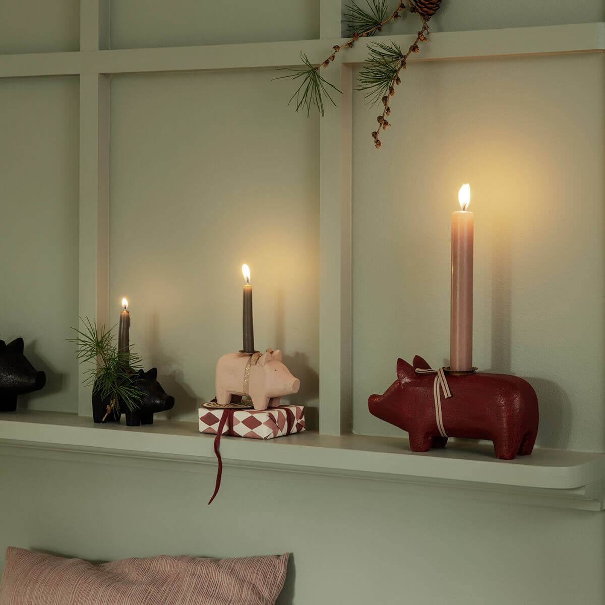 Schaffe eine gemütliche Weihnachtsatmosphäre in Deinem Zuhause mit diesem hölzernen Kerzenhalter. Kombiniere verschiedene Farben und Größen miteinander. Kerzenlichter Ø1,2 cm passen perfekt zu diesem Schwein.