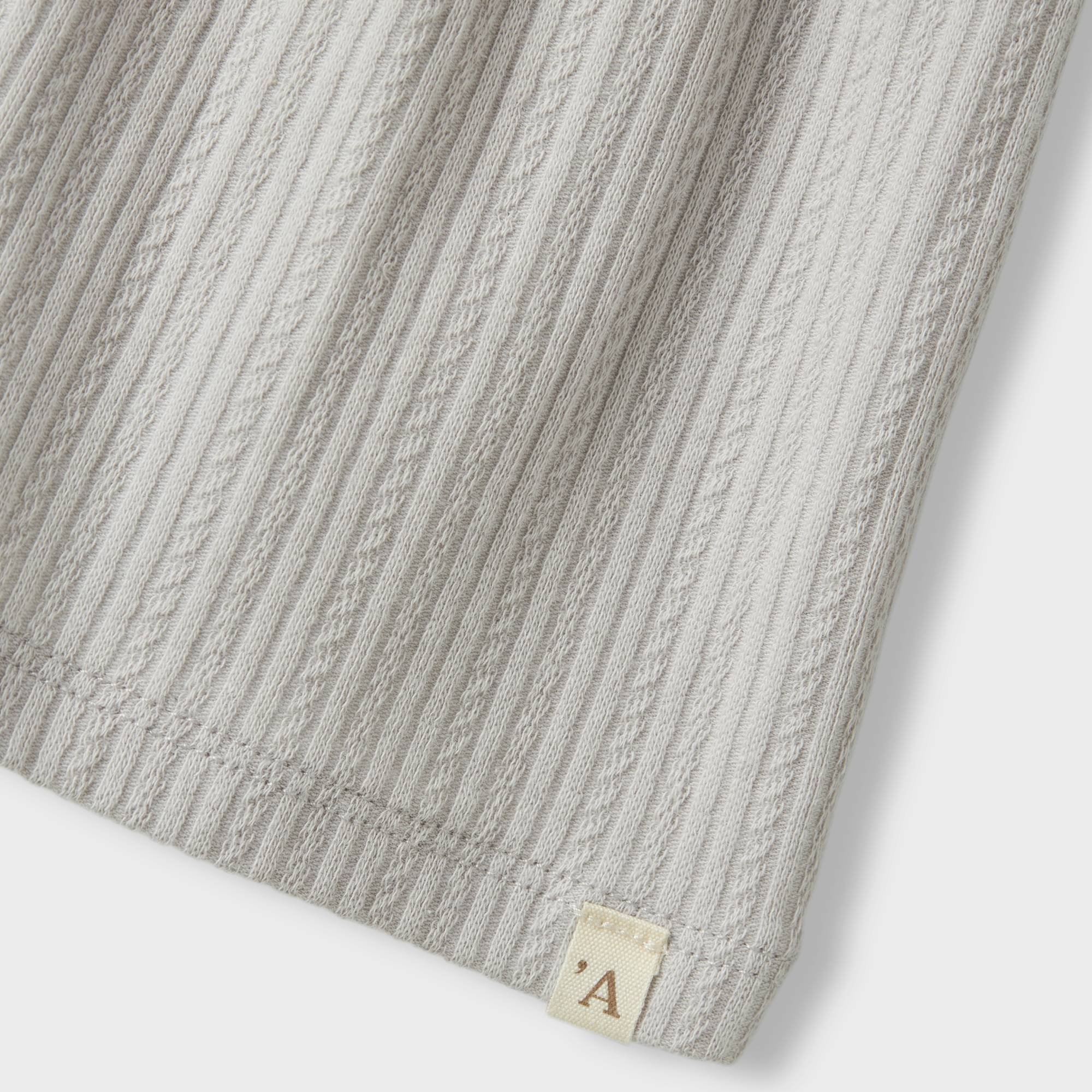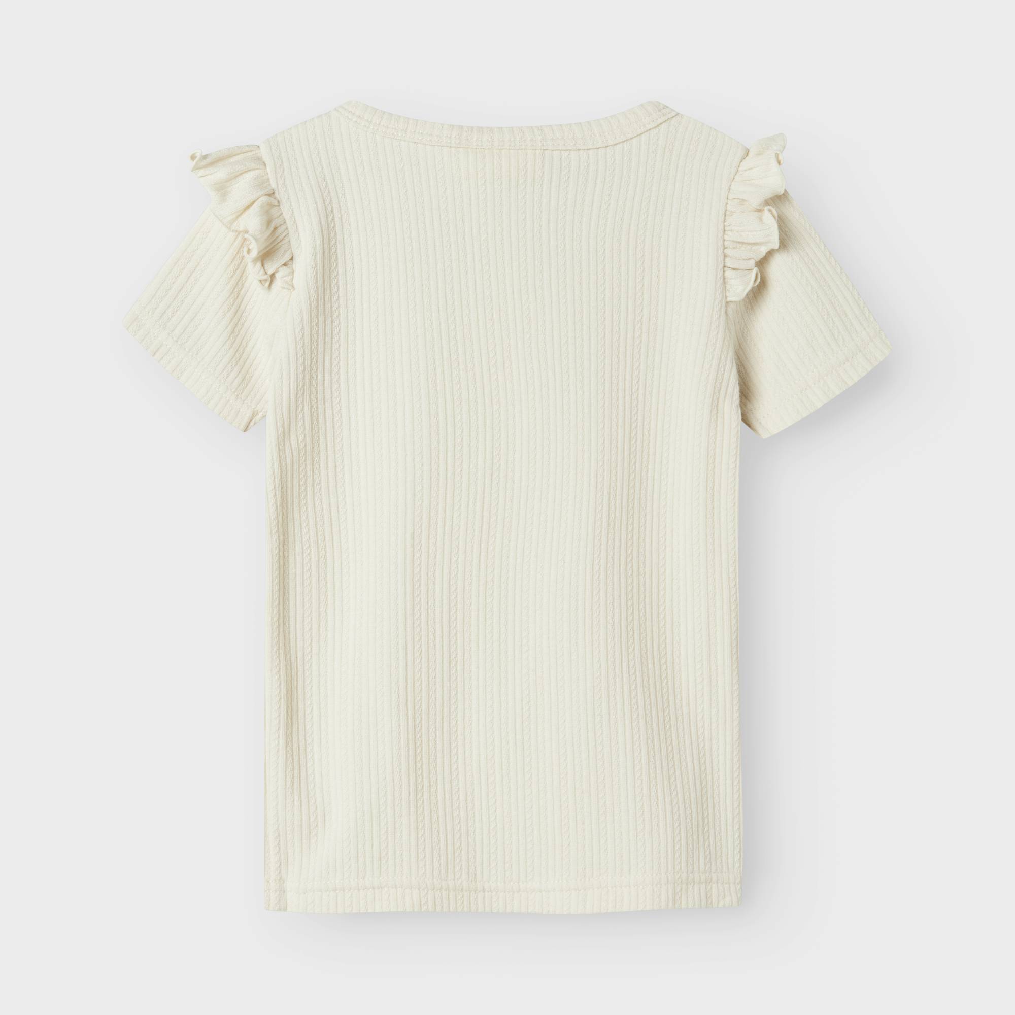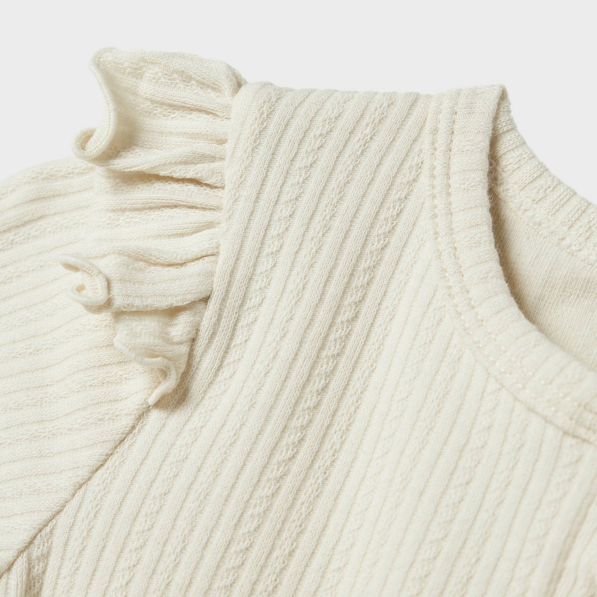Dieses süße Langarmshirt für Kinder bietet sowohl Komfort als auch Stil. Es besteht aus Bio-Baumwolle, die für ein weiches, angenehmes Tragegefühl sorgt. Die moderne Rip-Struktur verleiht dem Shirt eine besondere Textur, während die verspielten Rüschen an den Schultern und die kurze Knopfleiste vorne dem Design einen besonderen Touch geben.